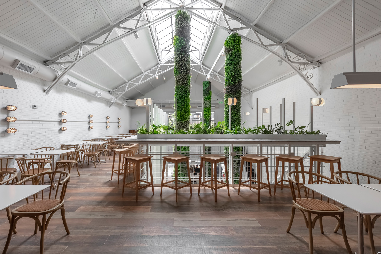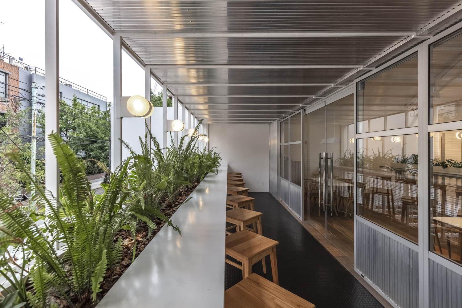 在幕墻中,我們使用了位于不同深度的金屬網,以整合通過圓柱體設計的植被。這種創意餐飲空間設計策略使我們能夠可視化舊外觀,這表明有興趣保留舊建筑物的歷史。通過此操作,我們設法統一了陽臺正面和正面的線條,從而實現了半覆蓋的使用空間。重復和調制使我們能夠從提議特別設計的照明燈的地方建立秩序,使人聯想起五十年代。同樣,木制壁板代表了與此時期相關的美學。我們提出了一種生態感知的體驗,在這種體驗中,大多數游客會感覺好像他們是在帶有模擬神奇植被元素的舊溫室或花園中。