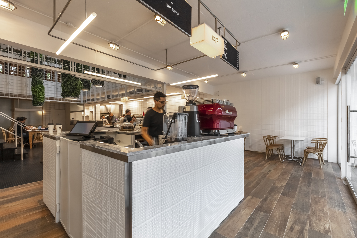 該創意餐飲空間設計項目受到現代,中立和工業細節的影響。中性由其材料和白色陰影的平衡給出。除了波紋鋁板和黑色橡膠地板的細節外,其所有材料均已用于黑白色調的平衡。從一開始,我們就知道該品牌就是它的名字(Fresco意思是西班牙語中的Fresh),這個地方的特征在于其簡單的材料,新鮮和天然的產品。從這種反思,我們建議實現一種活生生的存在和突出的性質,避免陷入靜態性質的使用。這種性質在其所有干預措施中都是形式和功能,它們既充當照明系統,又充當其多個酒吧中的活躍景觀。