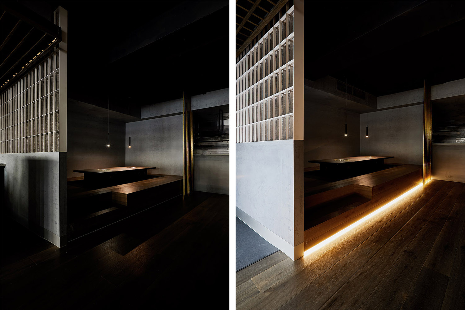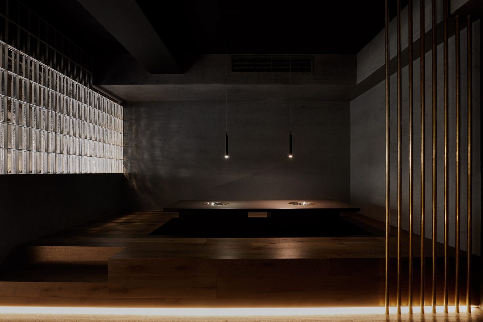 以白光照亮的吧臺與木板條制造的天花板構成了整個空間的核心部分。實心的玻璃磚被用于分隔空間。抬高的用餐區以深色木地板鋪設,與懸掛在餐桌上方的燈共同營造出別具一格的用餐體驗。在這里,美食是絕對的主角,精心烹制的優質肉類與蔬菜構成了餐廳體驗的一部分。