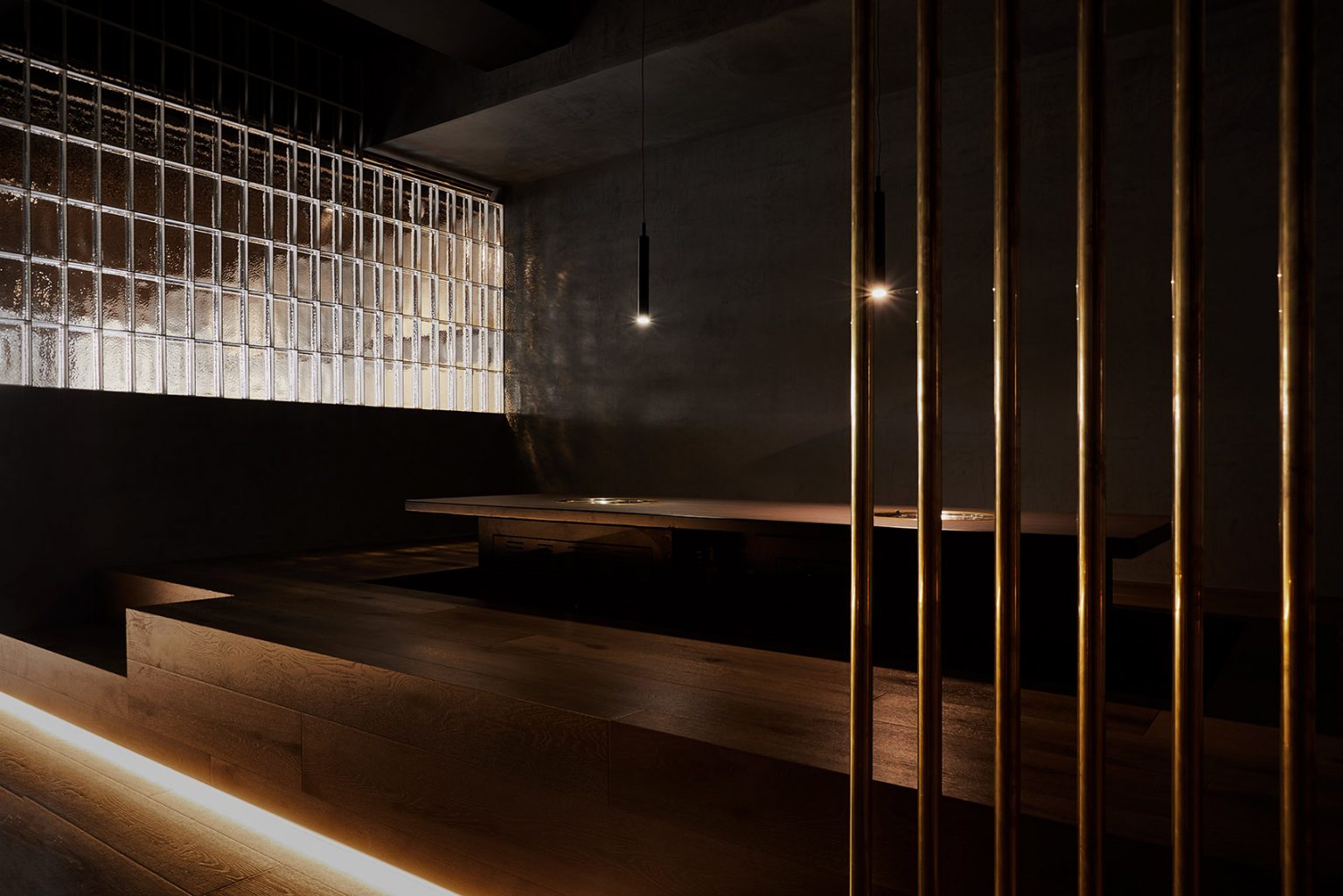 拉絲黃銅材質的柵格是對傳統竹木的當代化詮釋,起到了遮擋和劃分空間的作用。低垂的吊燈將人們的注意力引向食物,同時也讓發光的吧臺在空間中顯得更具穩重感。