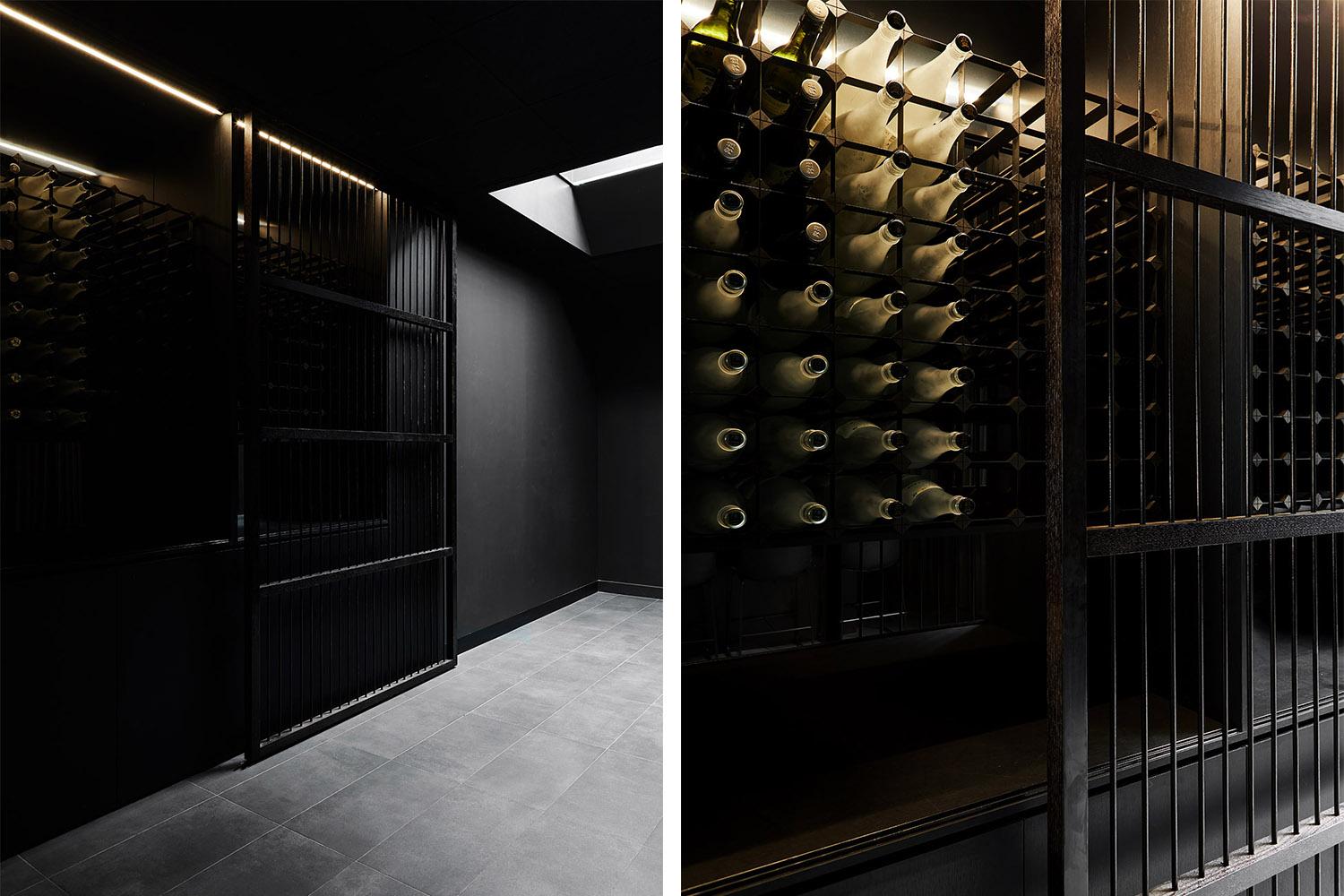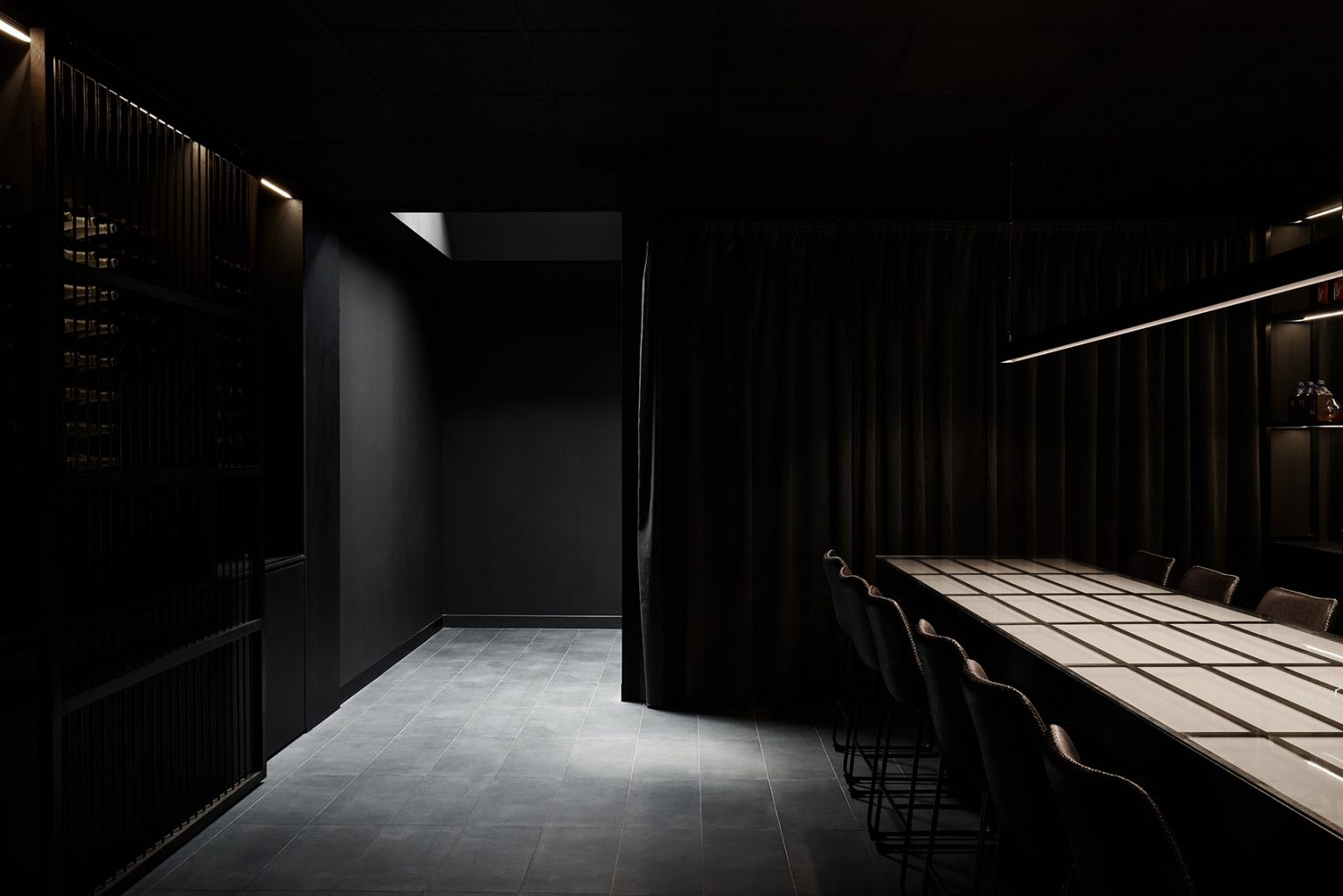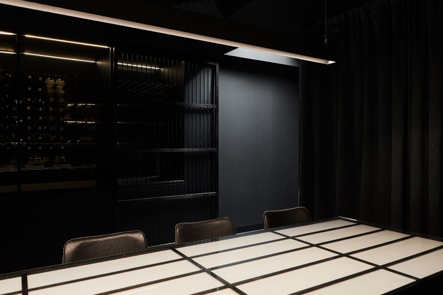 在進入空間的一瞬,客人的目光將首先被一面通高的、帶有可移動木制屏風的儲物墻吸引。黑色的家具元素呈現出細膩的質感,并配合以最低程度的照明,保證了酒吧的私密氛圍不受破壞。酒吧的中央設有一個被照亮的柵格酒桌,與其上方懸掛的線性LED燈共同奠定了整個空間的氛圍基調。桌子后方的酒架陳列著最優質且稀有的日本酒,酒架背后則隱藏著一個帶有內部設施的儲藏室。后墻處的黑色窗簾為幽暗的室內增添了一抹柔軟氣息。餐廳和酒吧的設計在不同的風格間巧妙轉換,將傳統日式建筑元素融入到澳大利亞的環境背景當中,在兼顧創新性的同時也對傳統表示了尊重。