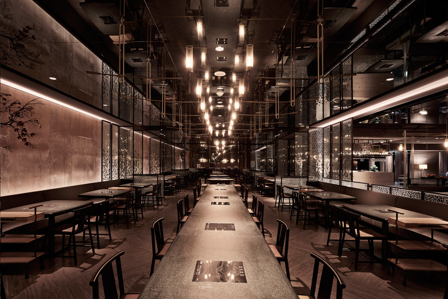 延長燈架的線條垂直彎折于地面上,又成了私密客席區的雙引線,并與暗灰色斑紋貼石桌面、交叉橫紋木地板、棕色系座椅布材搭襯,使其明暗有序、華麗中匿藏厚重的沉穩,共同展布出一區又一區的飲食領地。