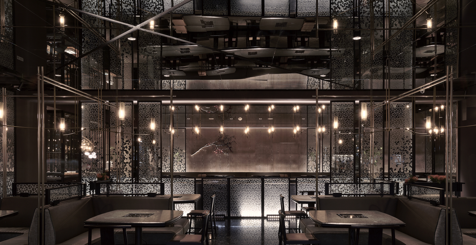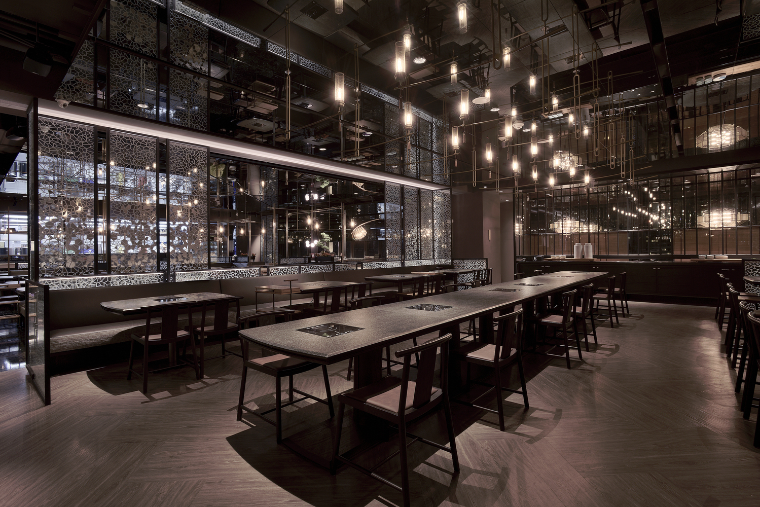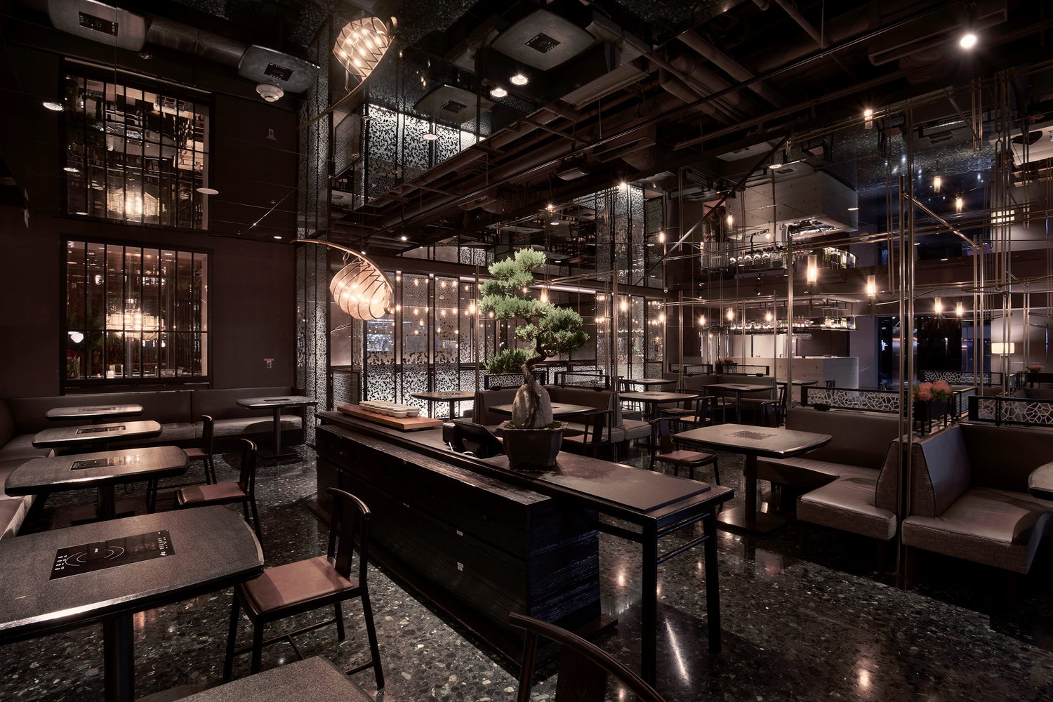 全區以黑玻璃鏡面的反射延伸效果,拉深天花挑高尺度,墨染般的天花又因光線均勻的飾點,加上鏡面制造去邊界化效果,而綠色深邃的石頭地板,不規則篆刻般的灰階點墨,讓整體空間,如潛行中的明光暗火,好讓一群人雜沓行走于漫漫長路上有所指引,也使得在空間中繚繞的眾味喧嘩,隨行依搭著光火般的淋漓,讓饌食時刻間或澆灌以神圣。