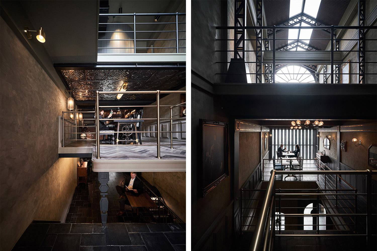 空間主材:拋光混凝土地板、黃銅扶手、煙熏膠合板、老式地磚、法國老式鐵窗格柵、浮雕鋁板、黑窯地磚、仿石涂層、原始外觀鐵板、復古花紋玻璃、復古鏡面