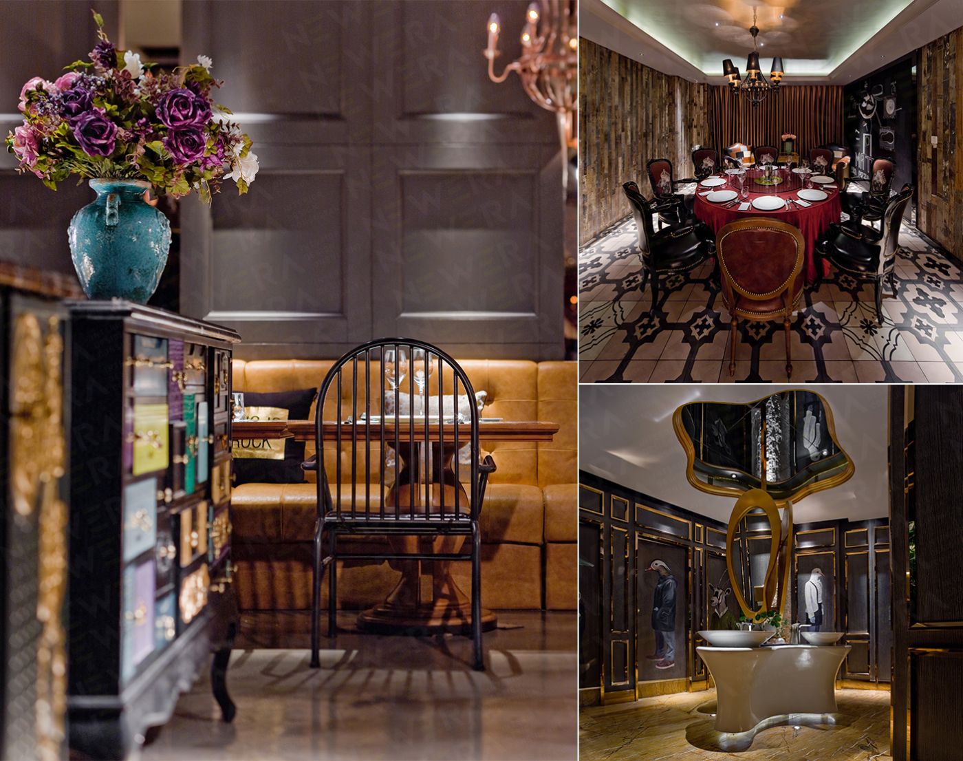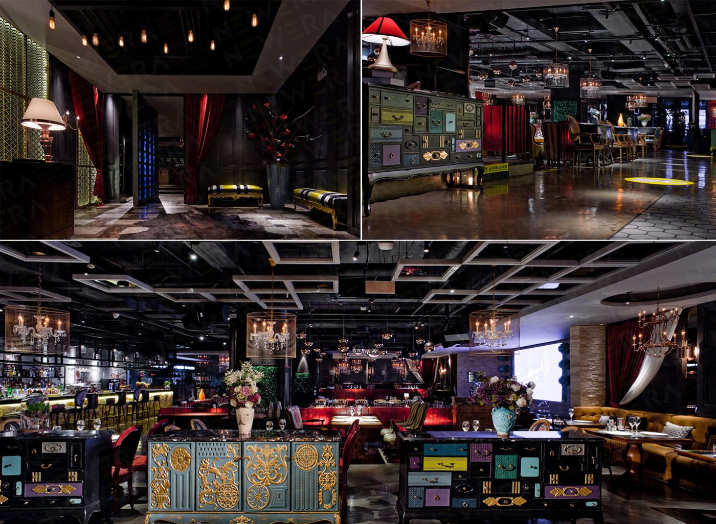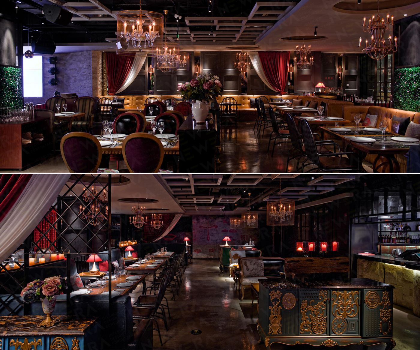 4℃扒房堅執對美味的極致熱愛,設計師為了突出其食材和味覺享受,在大廳就餐區采用了深色為主色調,搭配紅色天鵝絨窗簾、歐式吊燈和復古五斗柜,營造出低調高級的就餐氛圍。