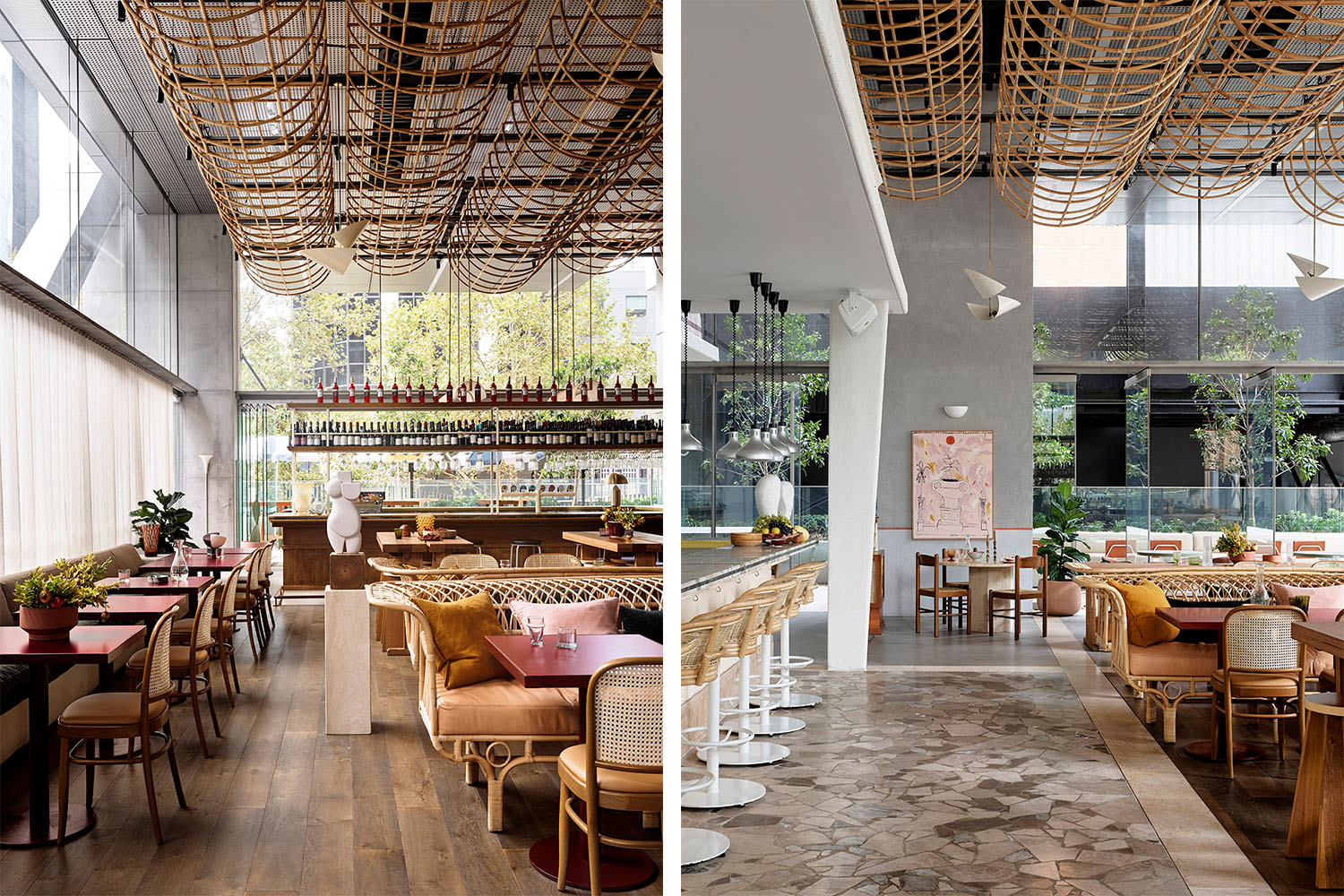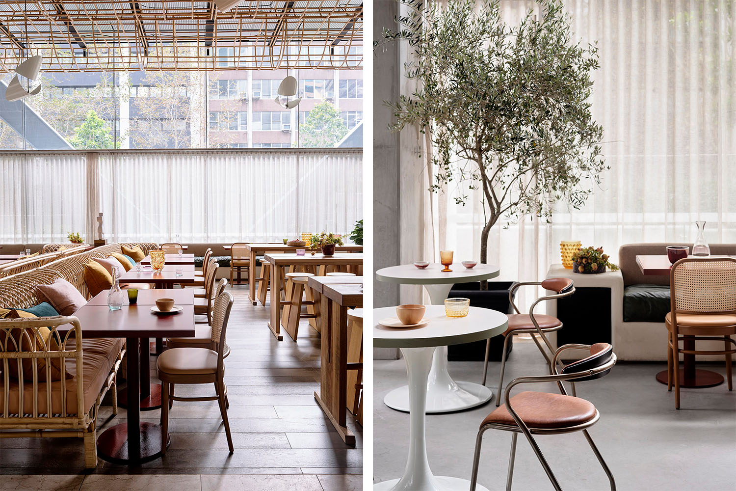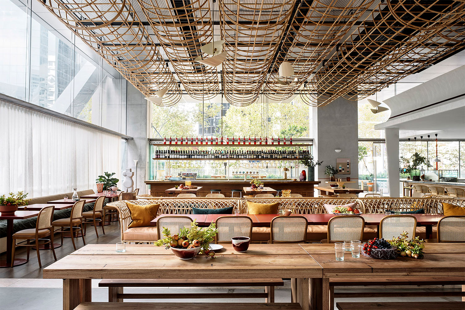 耐用的現代家居為空間賦予了質樸而柔和的氛圍,回收的木材、橄欖色和杏色的皮革、鐵銹紅色的桌子與環繞著整個空間的奶油色亞麻布窗簾形成和諧搭配,藤條編織的“云景”天花板則緩和了銀色天花板的突兀感,為空間增添另一抹溫暖而自然的質感。