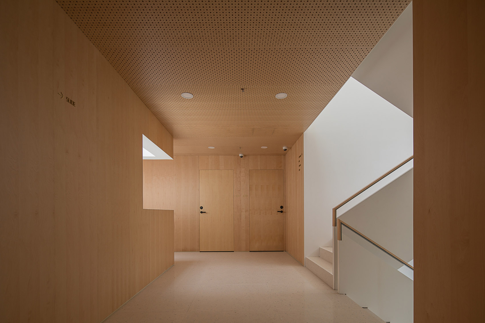 垂直方向增加中庭進行聯系,也改變了平面的平鋪直敘。原本黑暗的走廊變成空間的核心,在光線灑下來的那一刻所有人都很興奮:一個豎向上毫無特質的建筑,終于展現了新的可能。借助兩組長滑梯,中庭被組織成另一個動態活動中心,孩子和大人都可以快速穿梭在2-4層間,“樓梯間-走廊”構成的固定關系被打破。幾個空間的劃分動作同時吻合結構體系的加固原則,中間戶的分割和中筒的置入,都是對結構整體性的強化。