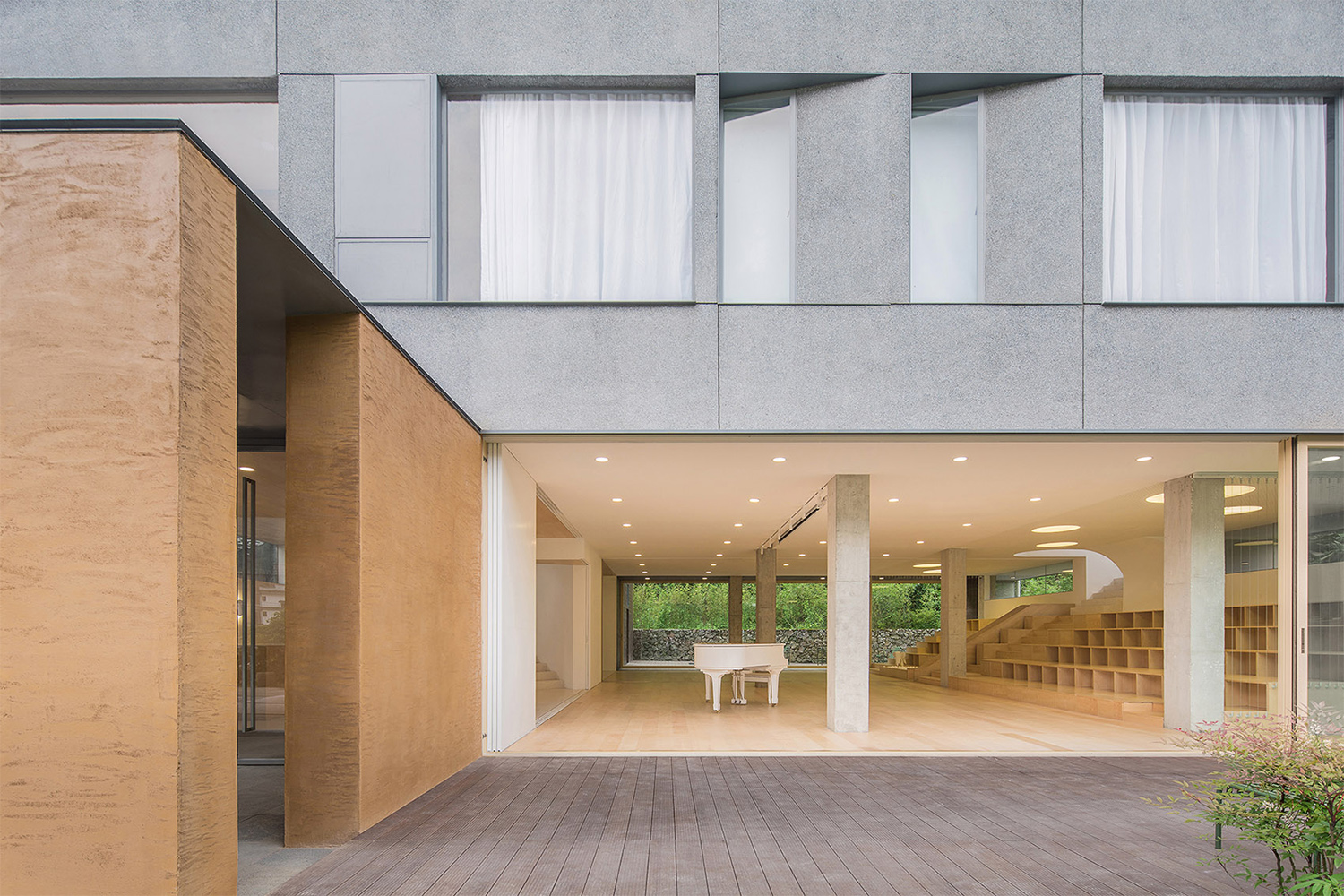 空間主材:水刷石、水磨石、木材、木地板、混凝土、玻璃磚、沖孔鋼板、白色乳膠漆