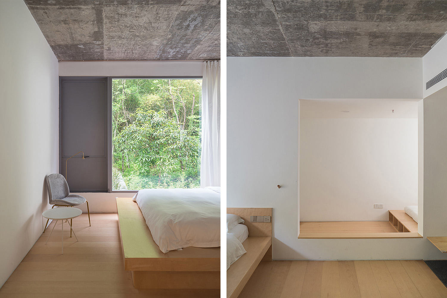 首層以上現有的承重磚墻可改動的余地不大,為了房間類型的豐富度,我們把中間一戶均分并劃到兩側,為兒童留出了半獨立的臥室和玩耍空間,形成主次空間滲透的親子居住體驗。室內和環境豐富的相處關系,則通過墻體、玻璃、玻璃磚等材質組合來塑造。