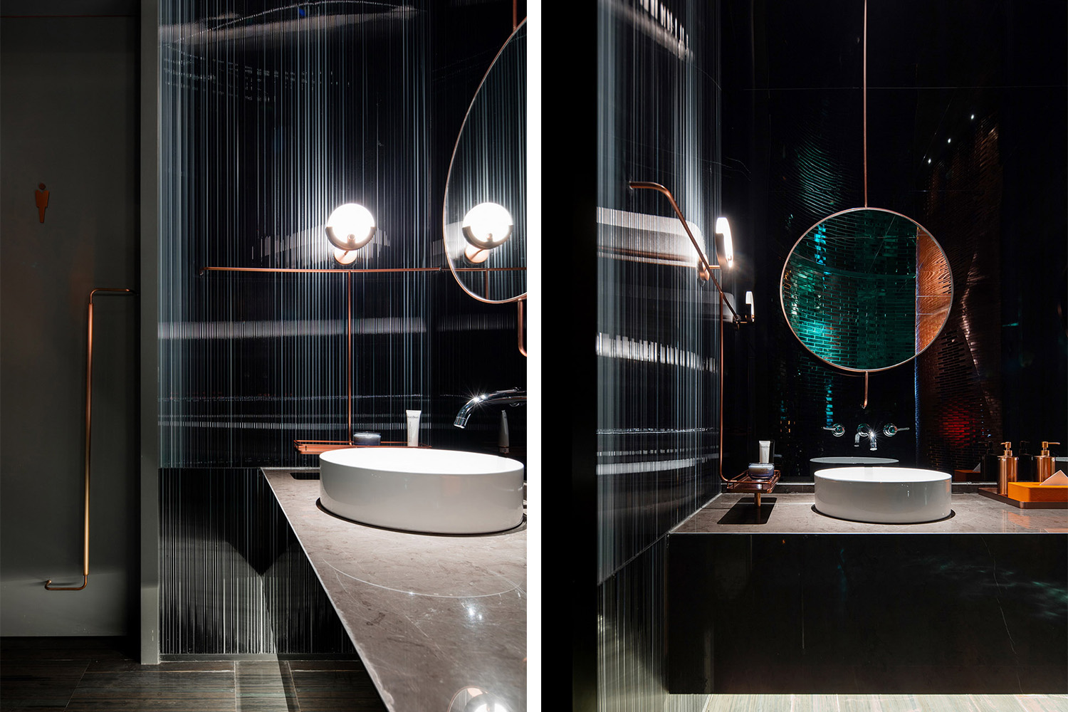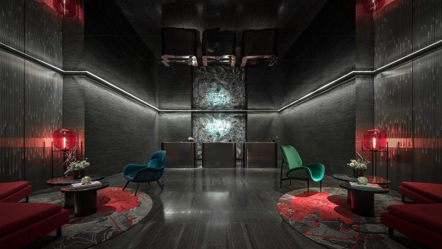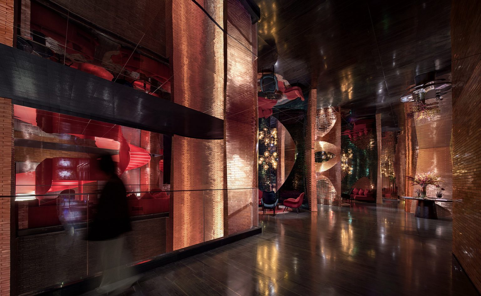一層入口,是營造視覺記憶的第一觸點。10米通高的空間,兩扇圍合50000片金屬磚墻巍峨聳立,延續環境語言的同時,形成絕對的包裹,將周邊的嘈雜迅速地隔離開,僅留下磚墻的形態作為線索,游絲一線牽連著整座城市的記憶,為整體設計埋寫伏筆,材質與色彩在這里打開一個微小的窗口,正待你徐徐展開。