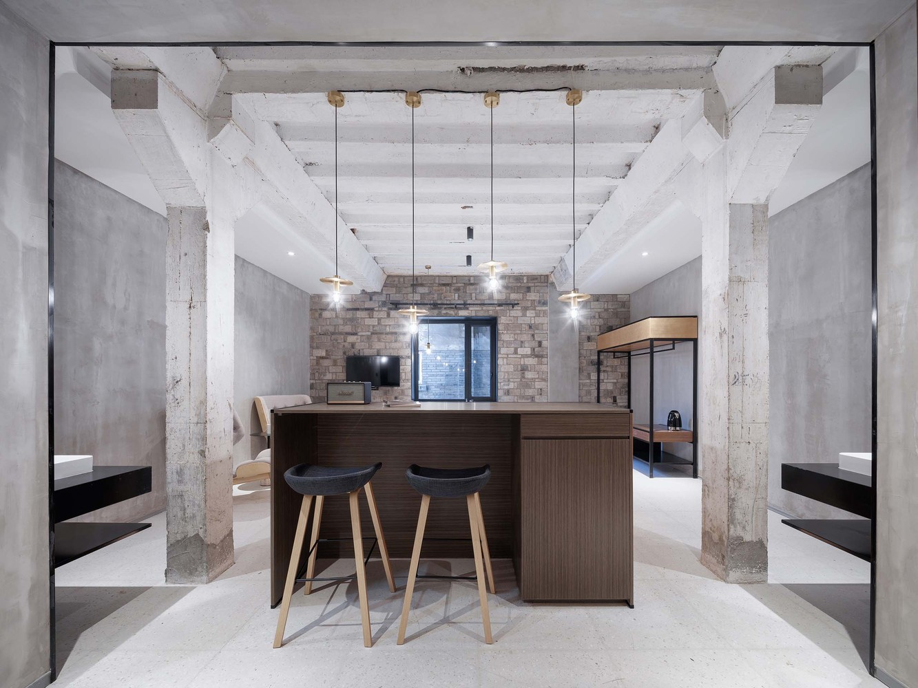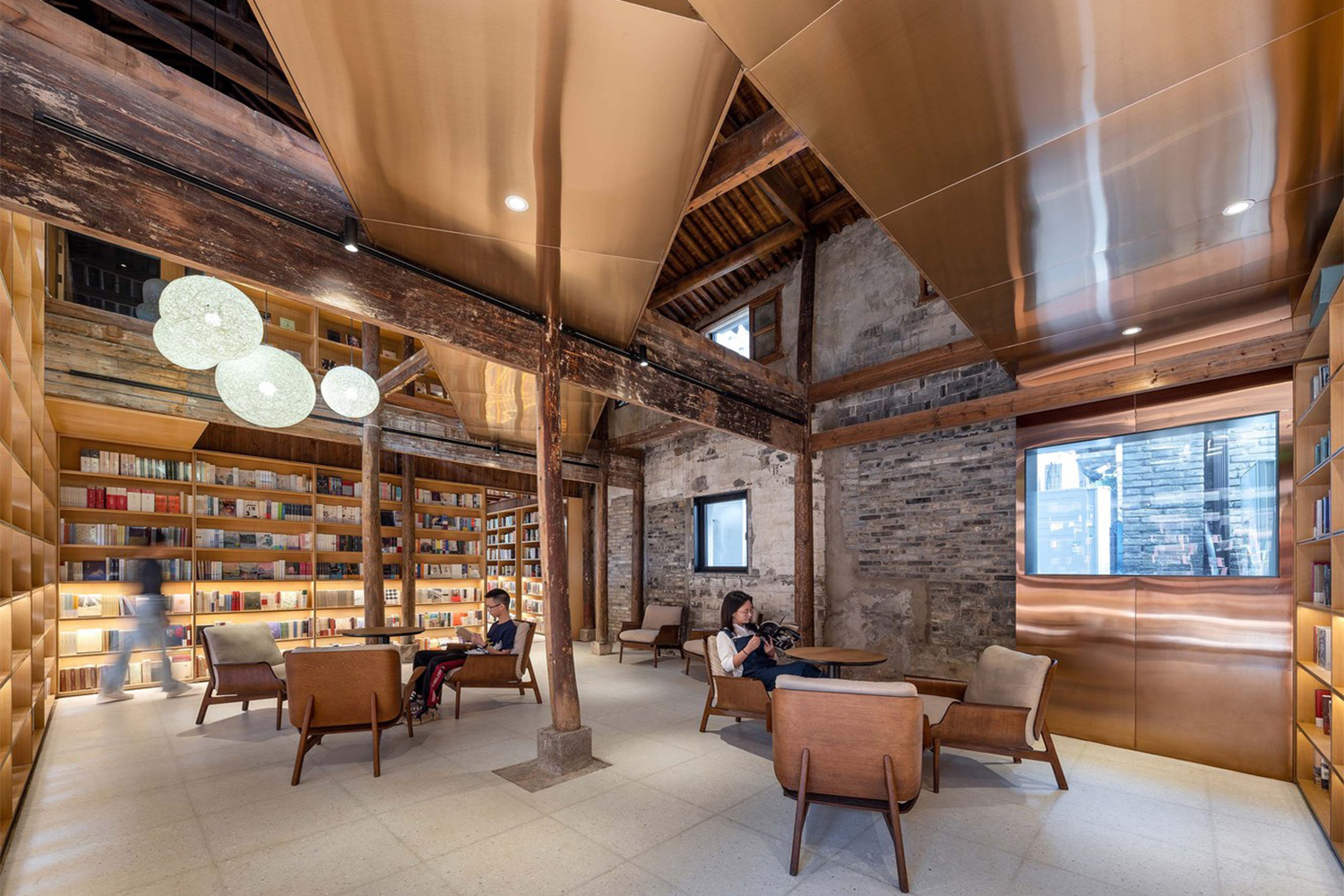 面對不同年代的老建筑,保留其現有的外觀并采用為其“量身打造”的改造策略。對于100年歷史的四合院,修舊如舊,盡可能的還原屬于歷史院落的生氣,在細節上保留曾經的“當鋪記憶”,再為其注入新的生命力;對于60年歷史的兩幢工業遺存建筑,保留一部分歷史和工業痕跡,在整體建筑修繕的同時,通過局部加入當代空間感受和空間使用方式,產生一種戲劇化的空間對話。