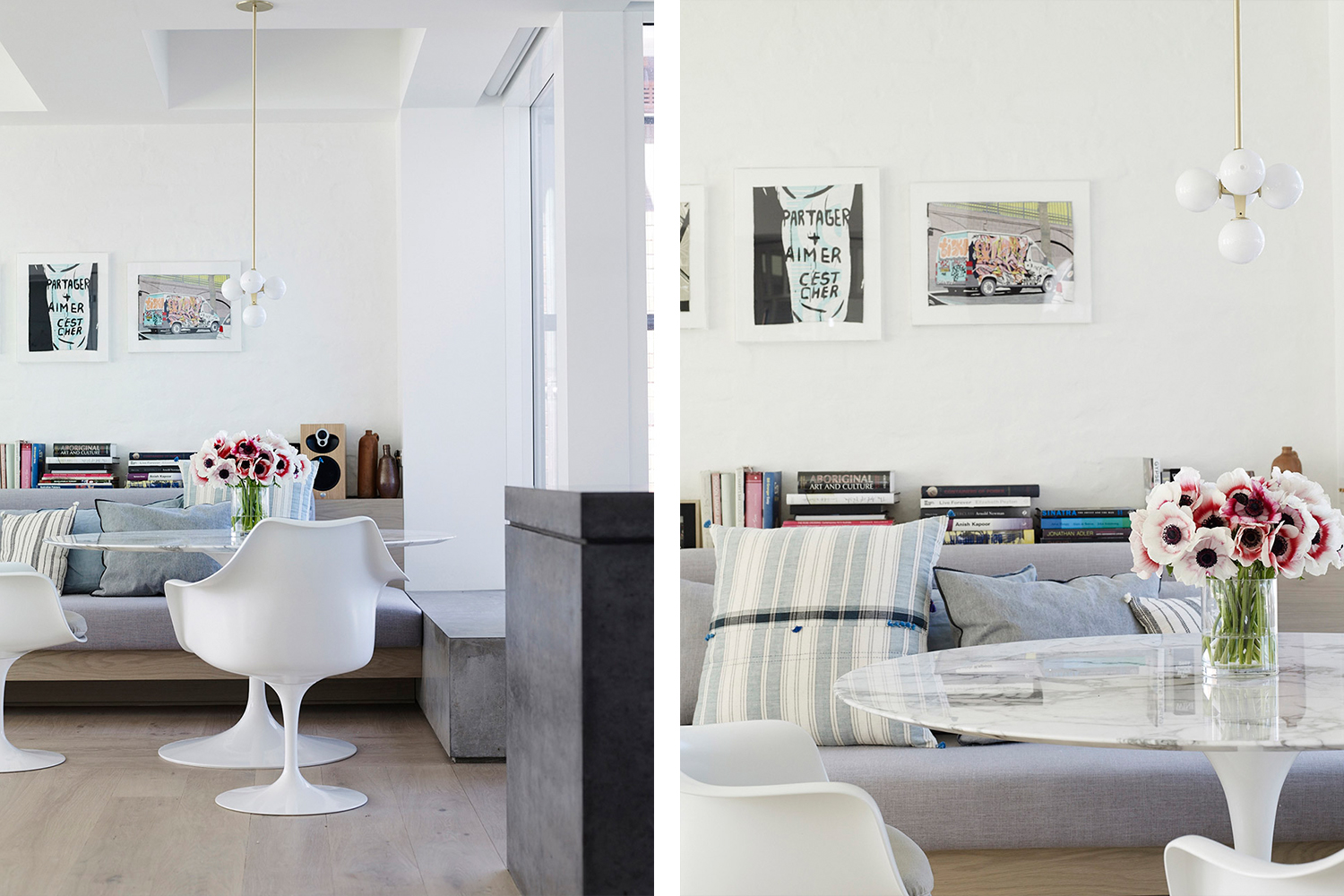 設計師保留建筑結構中的梁和柱,將住宅內部掏空,移除室內大部分墻壁,并在面向庭院的立設置巨大開窗,使房間內部享受充足的陽光。移除墻壁的最大問題在于藝術品不能靠墻而掛,因此設計師的主要任務是將藝術帶回到居住生活里。