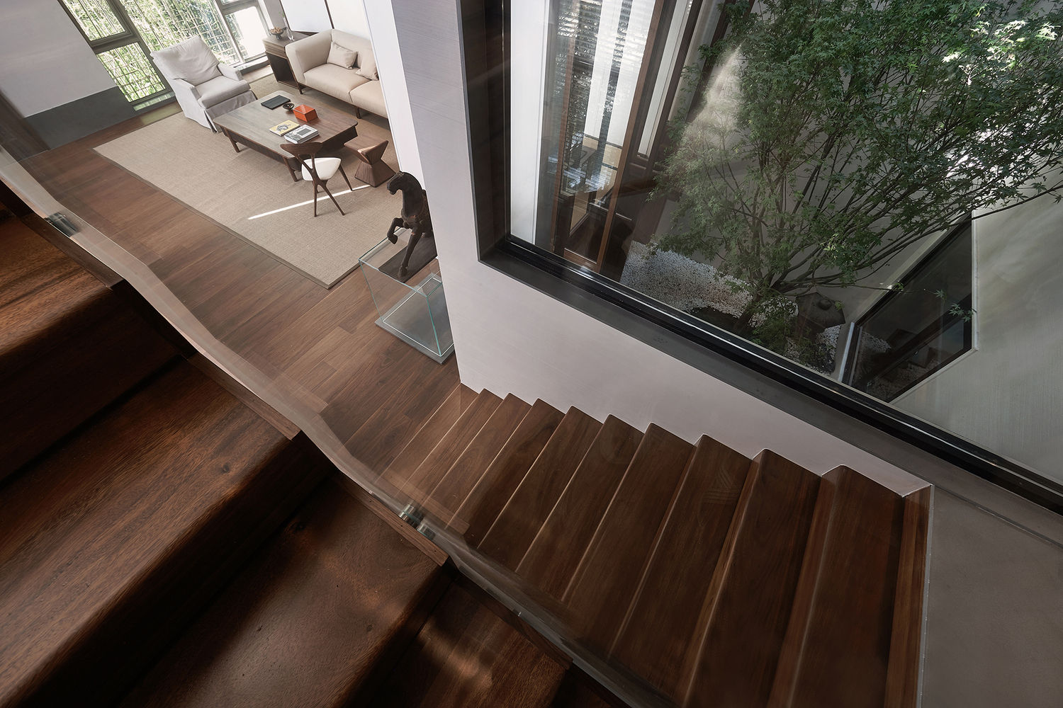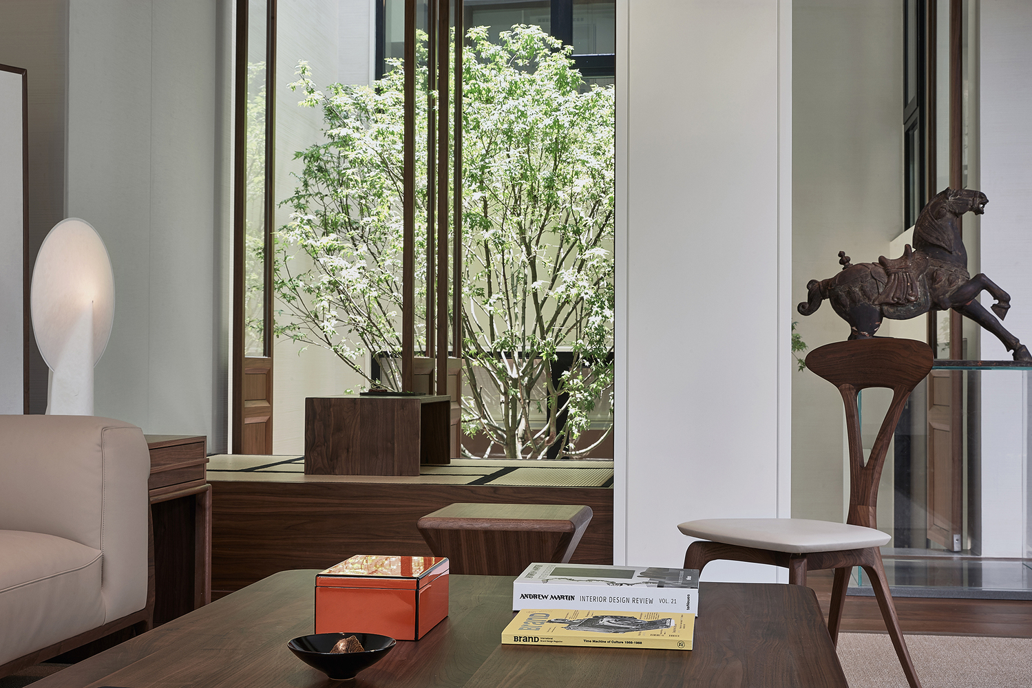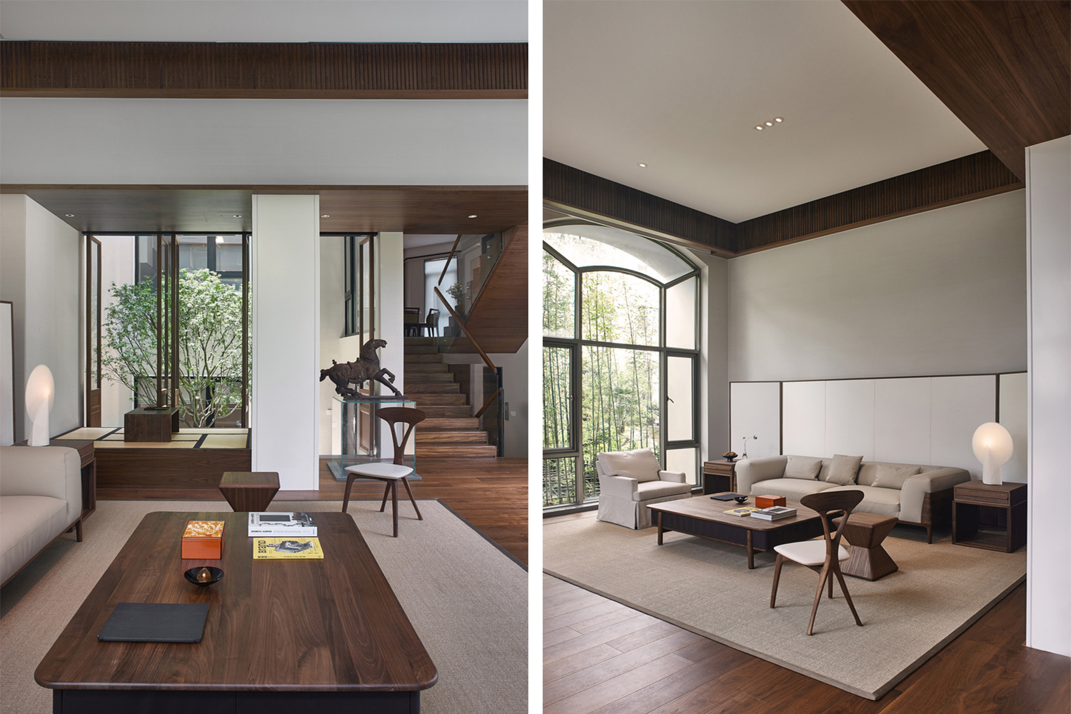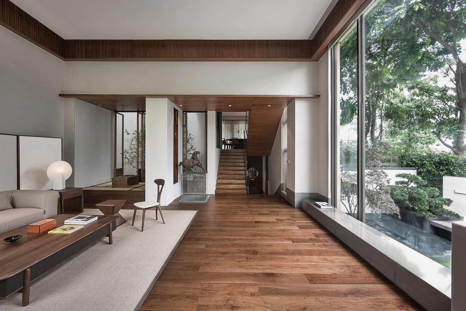 一樓整個客廳保留原有墻體結構,用白色拉絲藝術漆作為主基調,通過正面落地玻璃,讓花園園林景觀作為客廳主背景,充分尊重自然的力量,讓空間與室外達到自然和諧共生,讓每一位在里面的人,心可以打開,與自然對話。客廳利用原有的結構柱子設計成開放式的和室品茶區,品茶區與天井之間加了活動胡桃木屏風,讓此區域在一開一合之間與綠植、陽光、空氣發生關系。