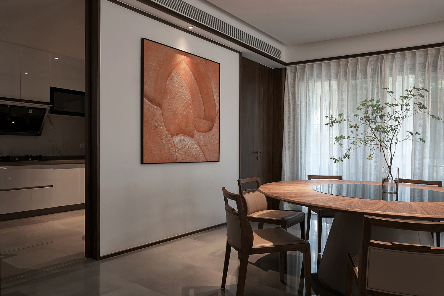 空間主材:胡桃木地板、胡桃木飾面、鋼化玻璃、肌理漆