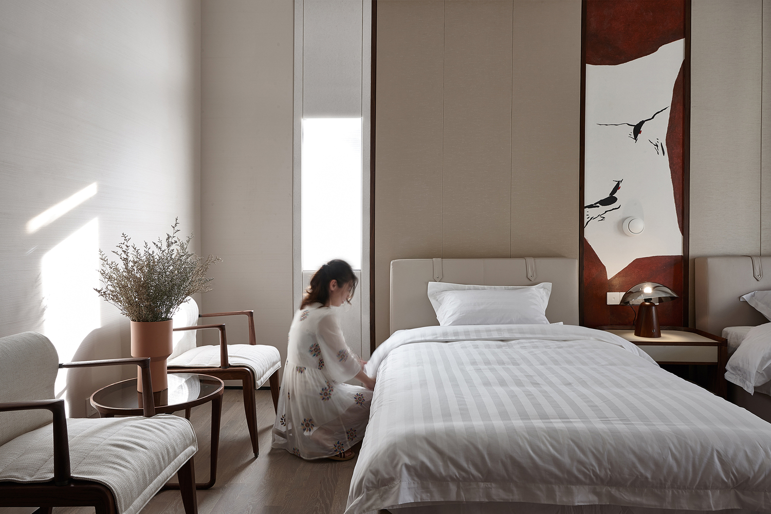 三樓部分,整層為主人區域,樓梯上端開了一個天井窗,讓充足的陽光可以灑下來,主臥區域通過設計成幾扇屏風式開門,讓打開的時候與開放書房區域可以共通,業主喜歡閱讀,有大量書籍收藏,整個設計成陣列式的藏書方式。書房分為閱讀區與和室區域,讓人在其中可以選擇不同的場景方式,閱讀、品茶與休息。這不乏是一種舒適的生活方式。