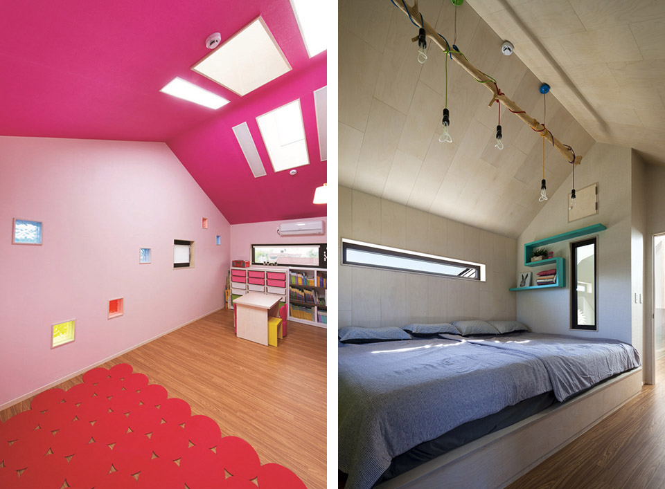 兒童房,衛生間,主臥室和工作室位于二樓。工作室面對院子,一邊讓家長在工作室也能注意到在外玩耍的孩子。整個房屋以孩子為核心進行設計,創造出有趣關聯還有互動的室內外空間。