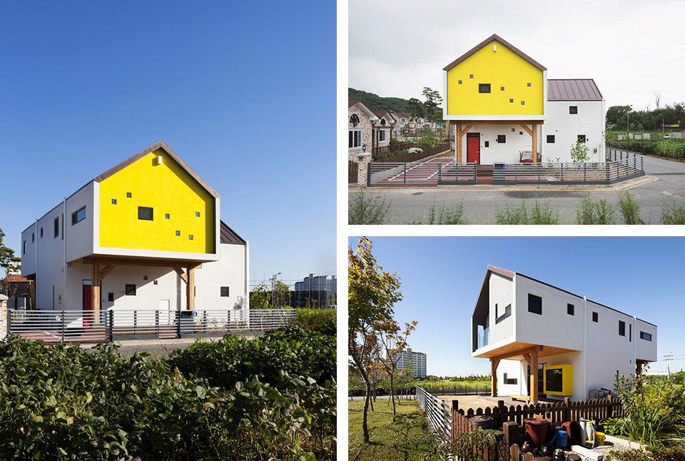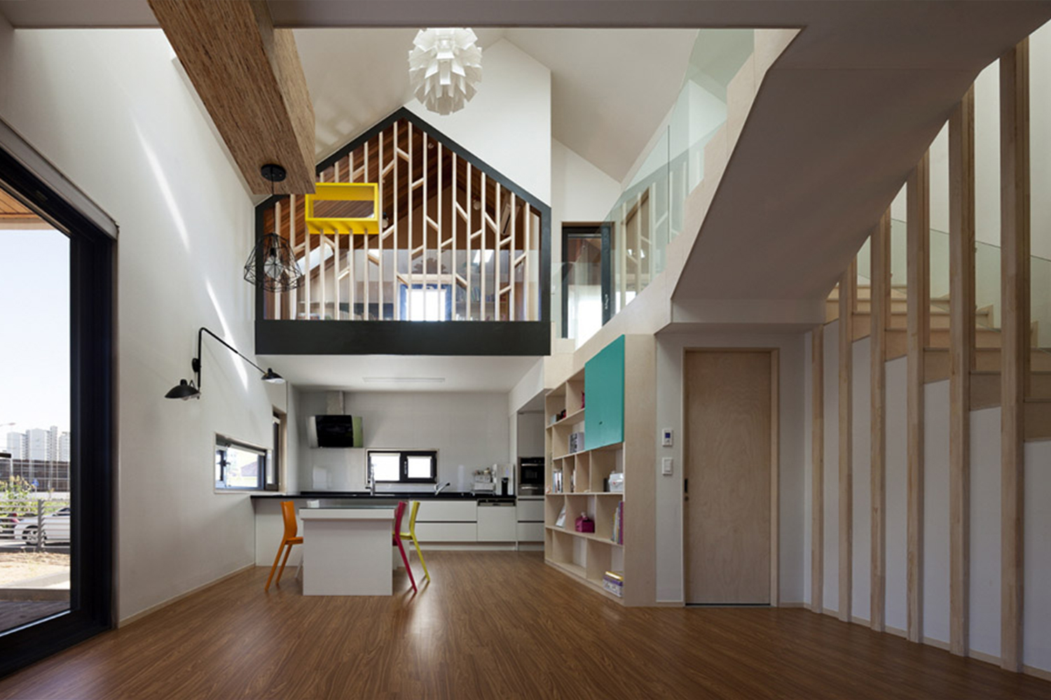 這棟全木結構的T形住宅位于韓國益山州市,T字兩端頭被挑起,分別形成入戶門廊和聯系客廳和花園的休閑平臺。一層為開放的大空間,容納了起居室,餐廳,廚房。二層則是私密空間,有臥室,書房,游戲室等房間。采用30厘米厚的膠合木實現整體輕木結構。