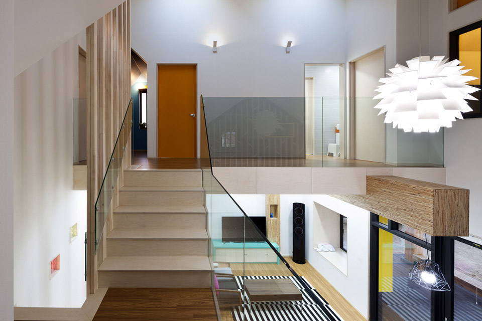 空間布局基于業主和他們孩子的愿望:是一棟可以享受到公園美景,能夠在院子中自由嬉戲住宅空間;室內,兒童游戲室安放在與樓梯相鄰的空間中,與高大客廳相鄰的墻面采用豎向格柵,這樣家長在樓下公共空間和二樓其他任何地方都能留意到孩子。
