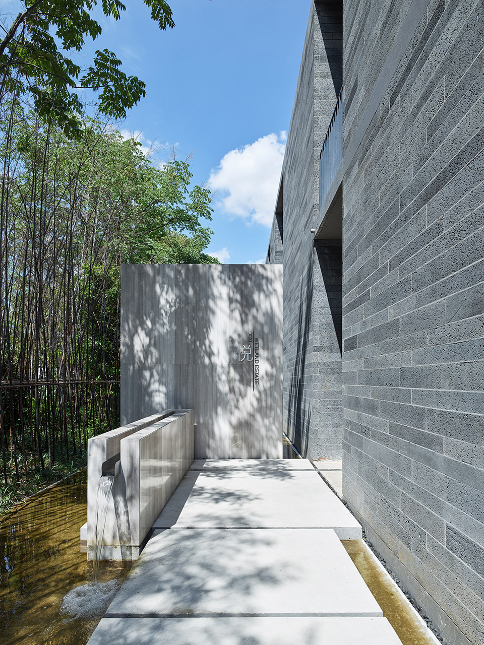 悅莊是有靈性的。沿水間的石臺(tái)走進(jìn)悅莊,右轉(zhuǎn)正式步入玄關(guān)的瞬間,會(huì)有那么一道光,從正面、從地面,撲面而來,有種充滿神性的幻覺。光是晶瑩的凝固的,卻又似乎隨水流歡愉涌動(dòng)。這是設(shè)計(jì)大師杉本博司給我們的靈感。他在設(shè)計(jì)護(hù)王神社時(shí),不動(dòng)聲色地運(yùn)用了玻璃磚,石梯上透明的玻璃階梯,能將光線導(dǎo)入地下幽暗的石室,輕而易舉攝人心魄。當(dāng)這種材質(zhì)鋪排在悅莊地面,玻璃磚中,一條水路通向光,墻體“裂開”一條等距的縫與之呼應(yīng)。就仿佛在說“上帝說要有光,于是就有了光”。