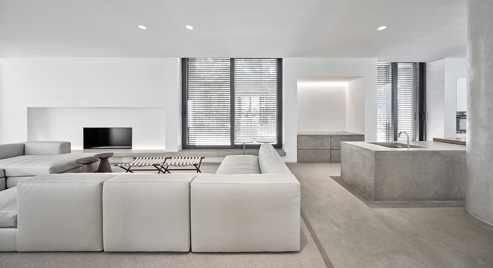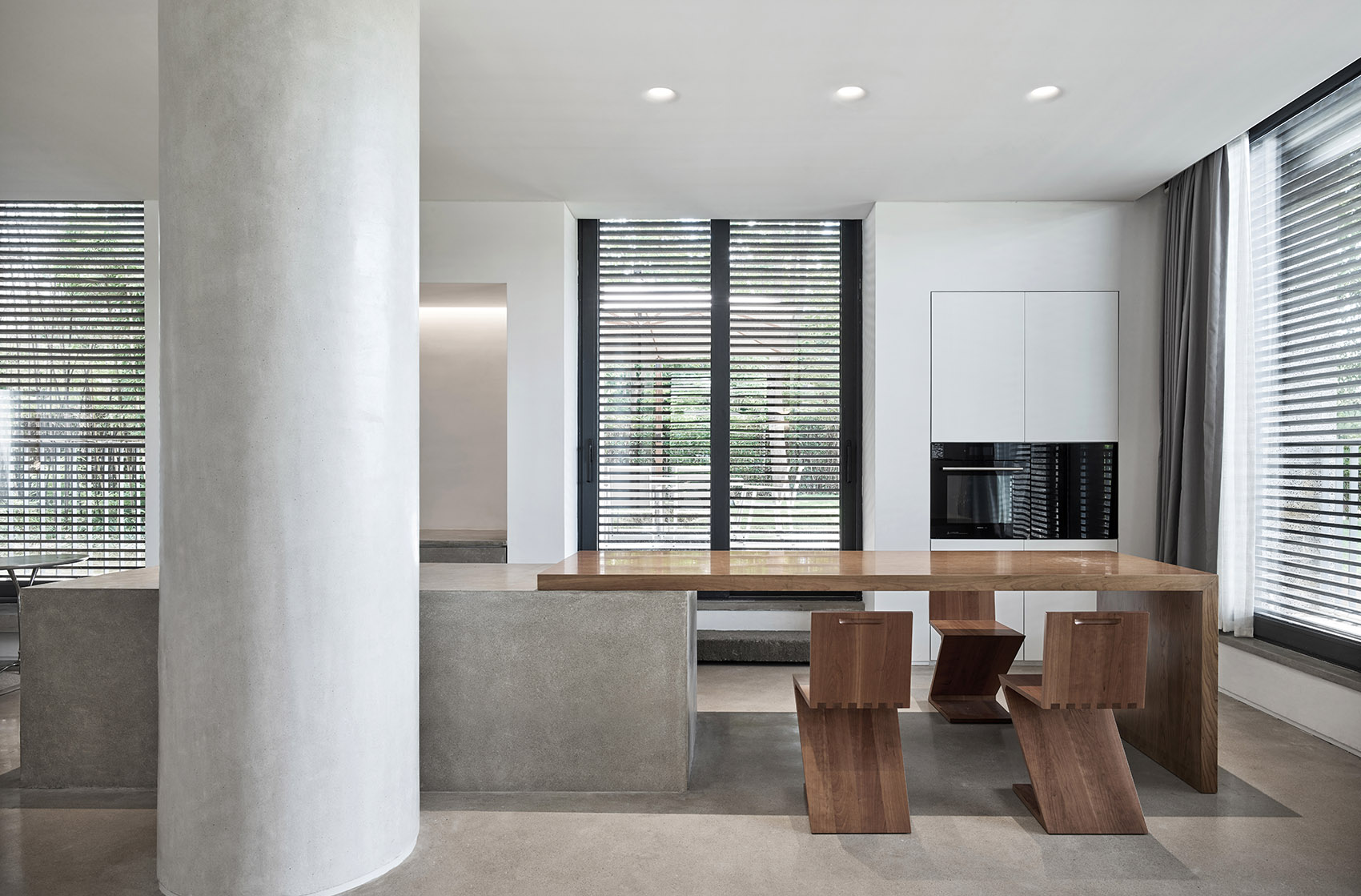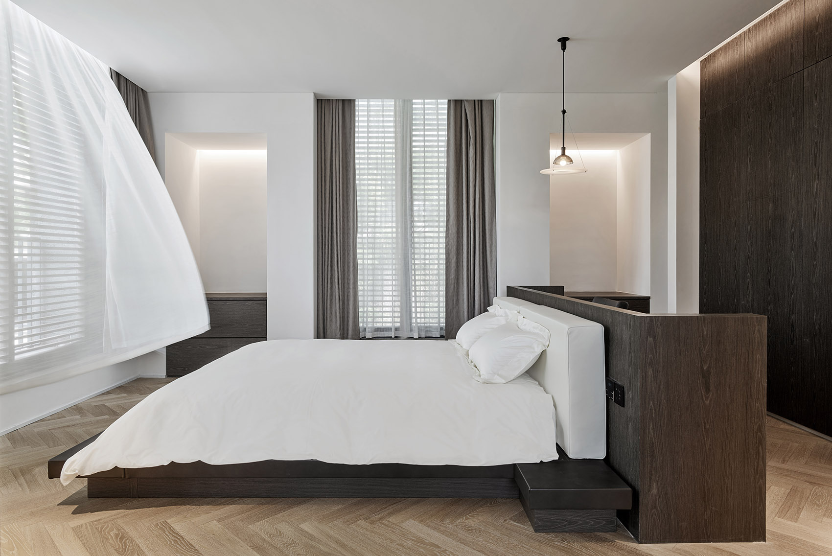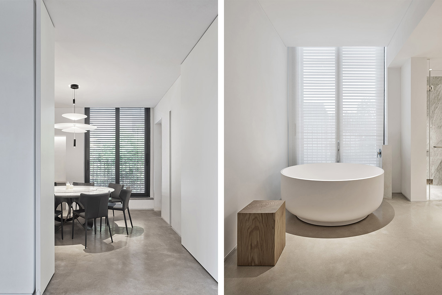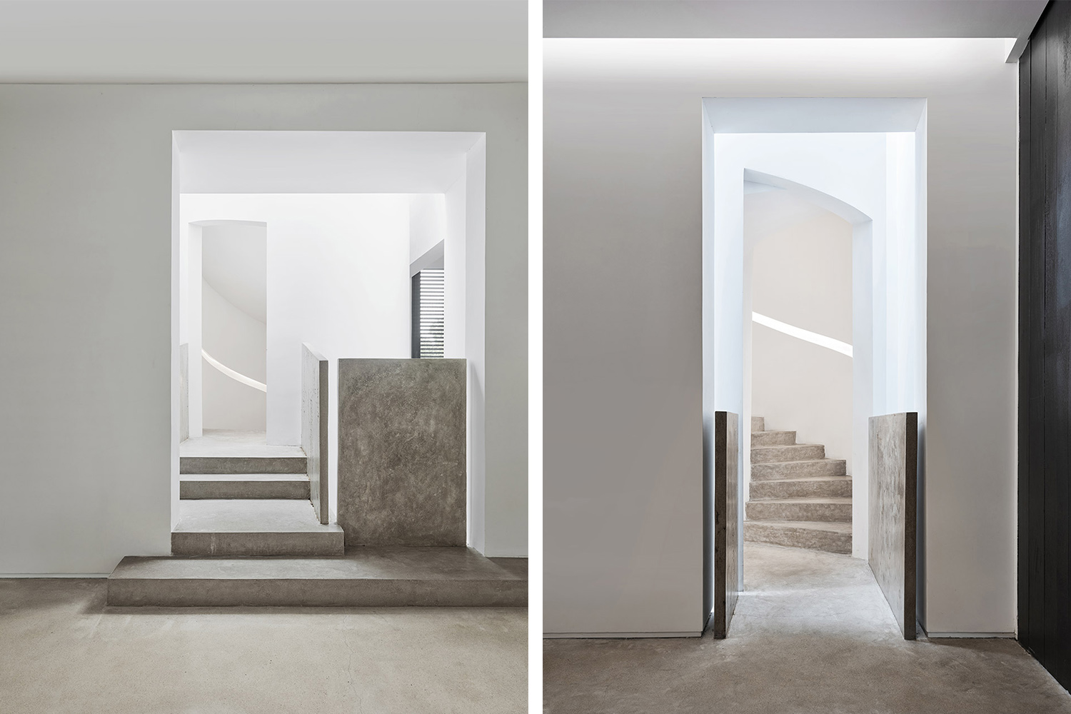 主人隨時(shí)隨地便可欣賞到從外自內(nèi)穿過的細(xì)流,收藏起自然最為珍貴的“聲、光、水”,時(shí)間在這里化為有形的流動(dòng)的韻律。當(dāng)視線在光的線條中觸發(fā)心跳后,悅莊的空間又在弧線中引入另一個(gè)高潮。純白的旋轉(zhuǎn)樓梯像是遠(yuǎn)古的鸚鵡螺,充滿迷之韻味。它與周圍各個(gè)空間之間,若即若離。從樓梯向外看、或從外看向樓梯,都無法看見對(duì)方空間的全部。在悅莊,一個(gè)樓梯就仿佛一個(gè)半封閉的禪室,隨著腳步一步步有節(jié)奏地邁動(dòng),似有若無間能感受到侘寂的境界。但,當(dāng)透過樓梯四周設(shè)計(jì)師有意為之的空間律動(dòng),有意無意間露出另一空間的動(dòng)態(tài)形影,似乎又在活潑潑地放大生活的小生趣。