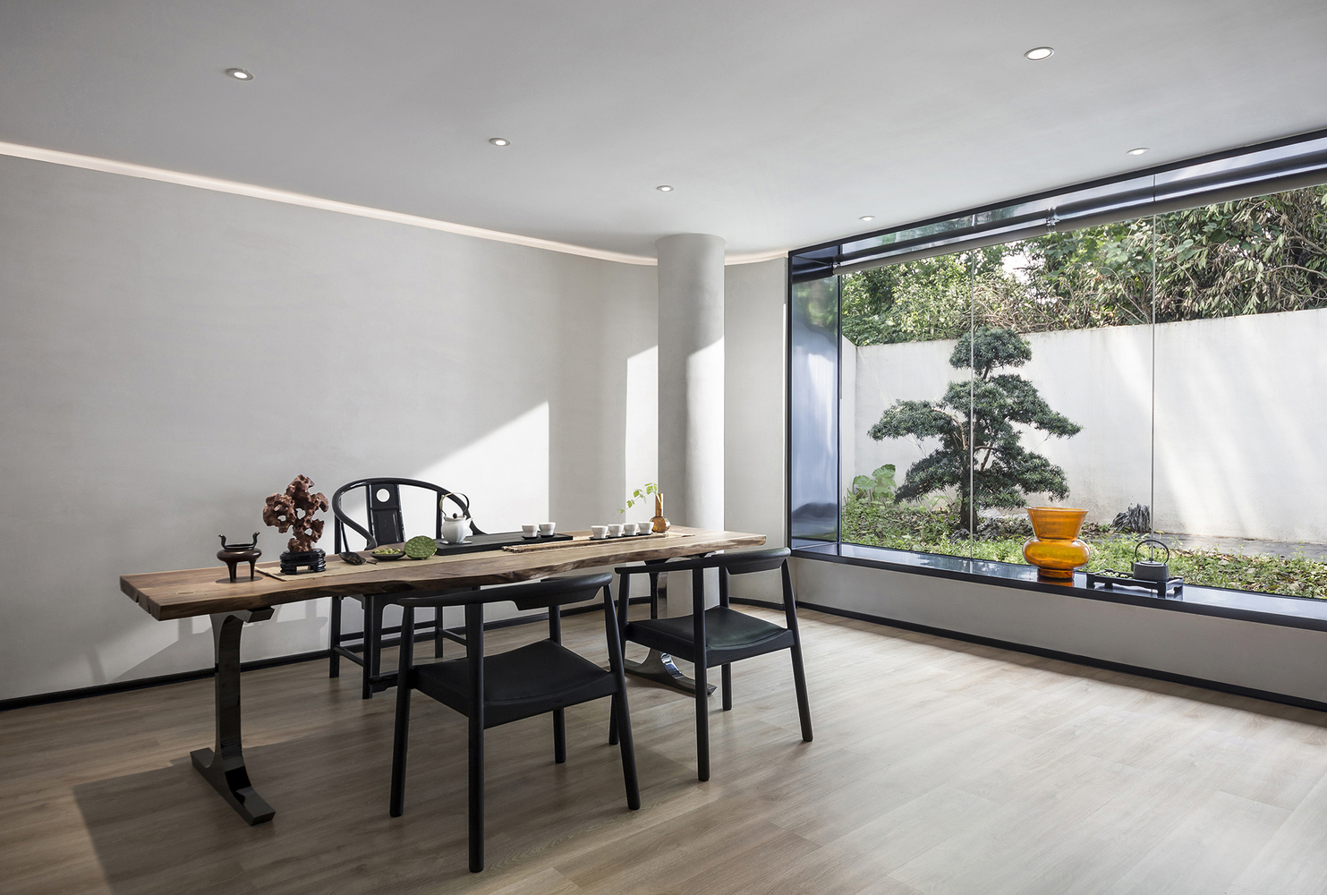 文化之間,情境之間。建筑為老建筑,設計師先對空間進行了梳理改造,空間分為上下三層,設有品茶、會客、辦公等功能區,各個區域規劃巧而合宜,一以貫之的白色與木質隔斷使不同空間渾然銜接(這句好像沒翻完整),似有若無的邊界模糊了空間的功能。不同于傳統會所空間的華麗,優雅的材質構成了空間的氣質,家具和藝術品在空間中散開,讓人靜下心來??臻g設計力求極簡,讓刻意的裝飾減到最少,原先厚重圍合的墻壁被通透的玻璃取代,視線由此隱于戶外風景里,顯現出對自然本真的崇尚與回歸。