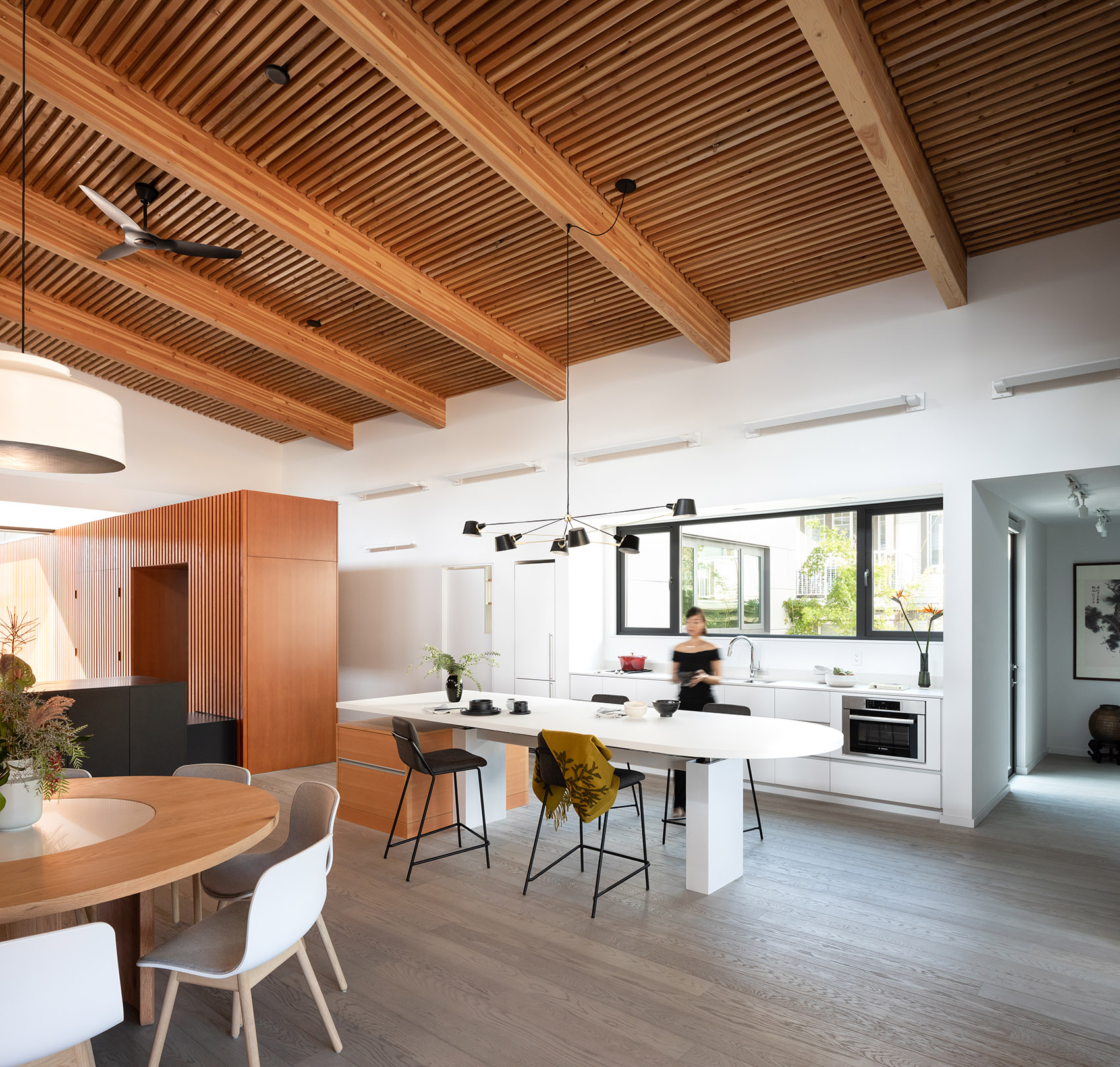 住宅正面的車庫采用一個24英尺寬的頂部雙折門,該門體選擇全高度的道格拉斯冷杉木作為覆層,與住宅前廳無縫連接,由此隱藏在木飾面下的車庫門便成為了住宅的第二個立面,激發了人們入內一探究竟的好奇心。