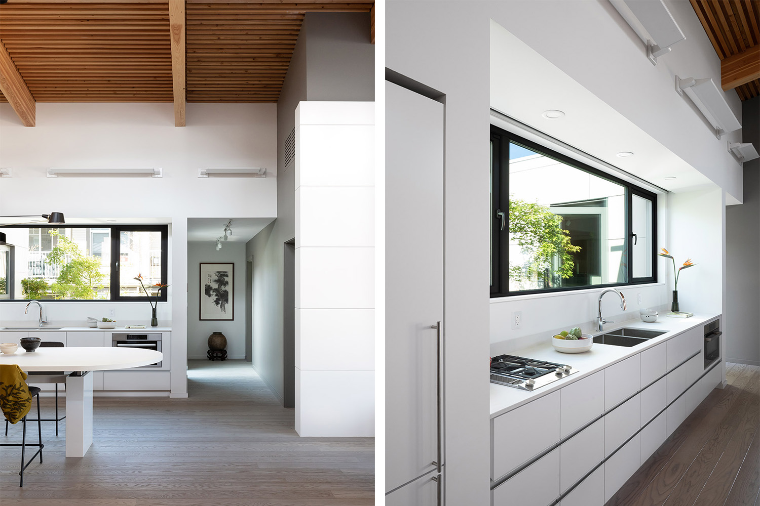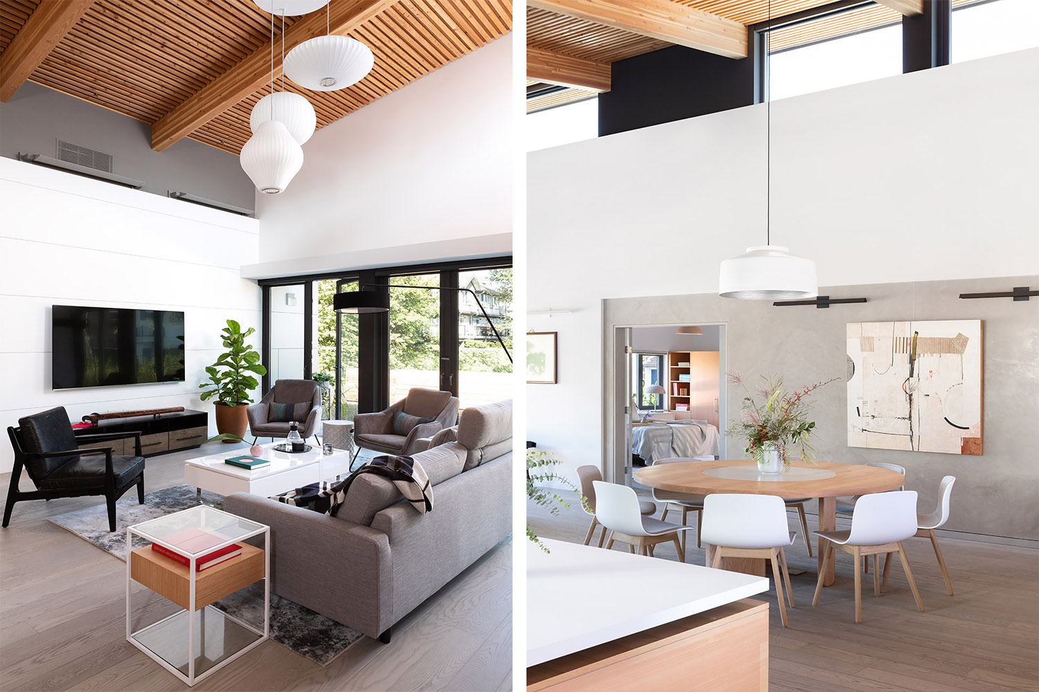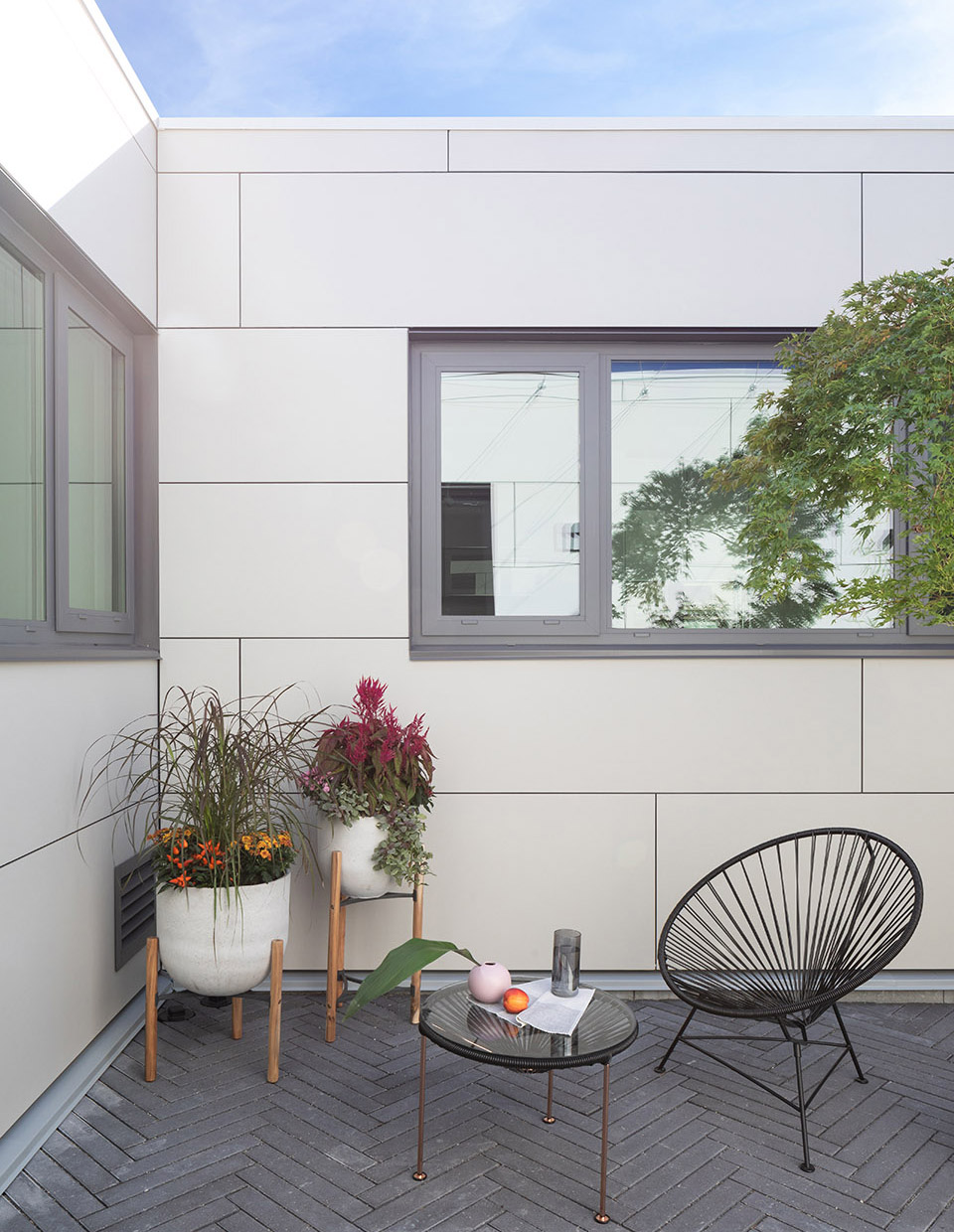 建筑師希望通過雙層通高空間中的釘子層壓木板天花板、自動控制的天窗和俯瞰著后花園的落地雙扇玻璃門將中央空間與室外環境聯系起來。入口采用雪松木飾面,巖石花園創造出一種流動感,迎接著每一位歸家的住戶和遠道而來的友人。兩側的私人生活空間通過不同的飾面在體量上加以區分,實墻與保溫隔熱的玻璃系統無縫轉換,交替出現。