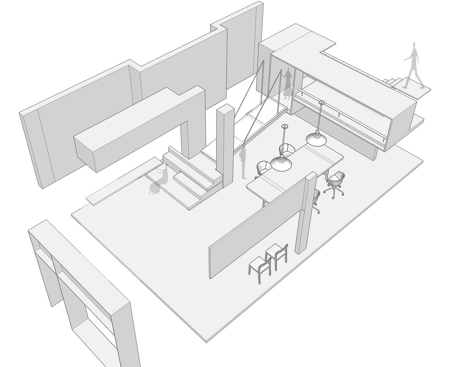 尺度感知:一層空間高度只有三點(diǎn)八米,我們?cè)谧鰥A層設(shè)計(jì)的空間尺度扣得非常緊湊,通過(guò)平臺(tái)的高低錯(cuò)落形成我們需要的空間和功能。