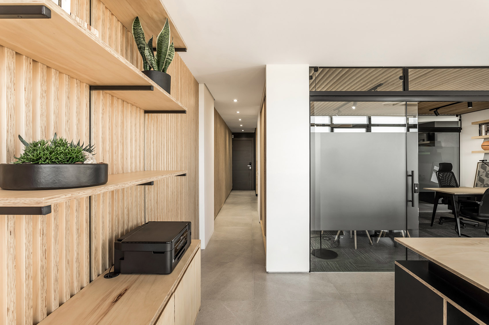 空間主材:木材、辦公地毯、玻璃、瓷磚、馬賽克