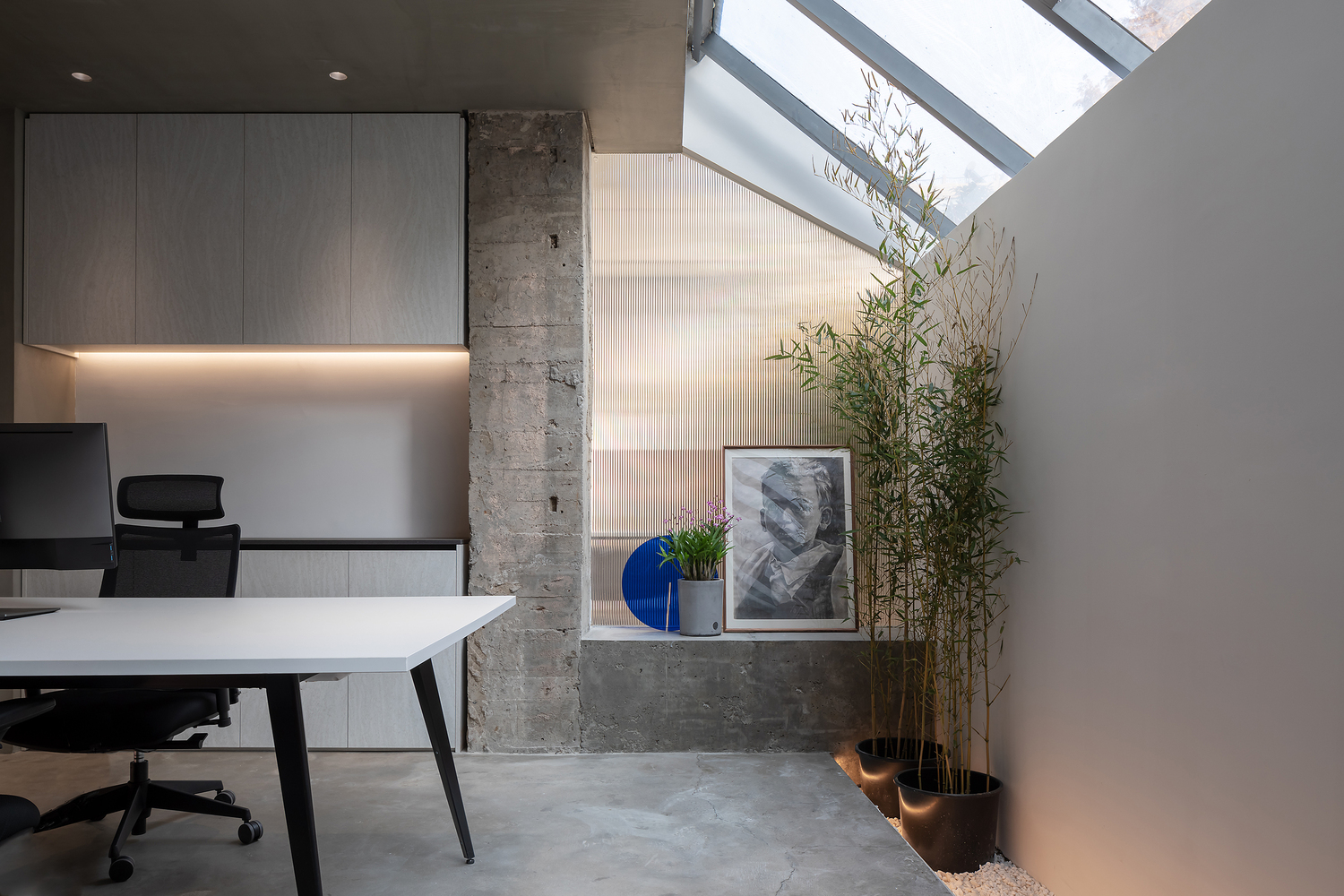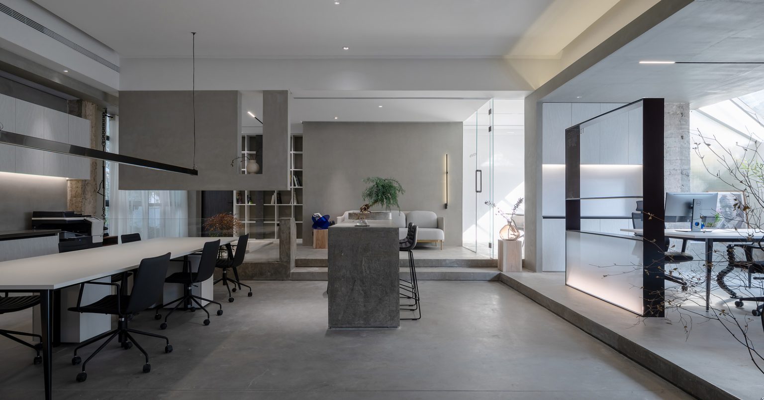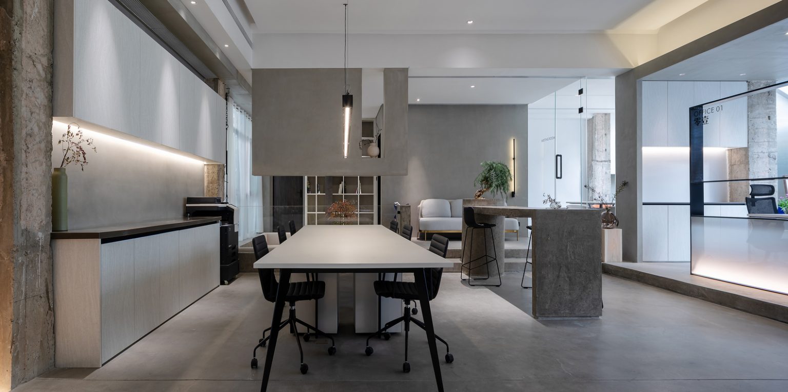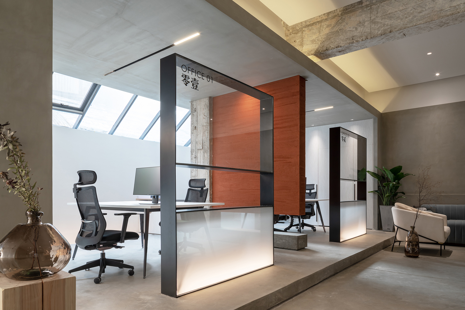 空間主材:混凝土自流平、水泥漆、夯土肌理涂料、長虹玻璃、霧面玻璃、白色乳膠漆