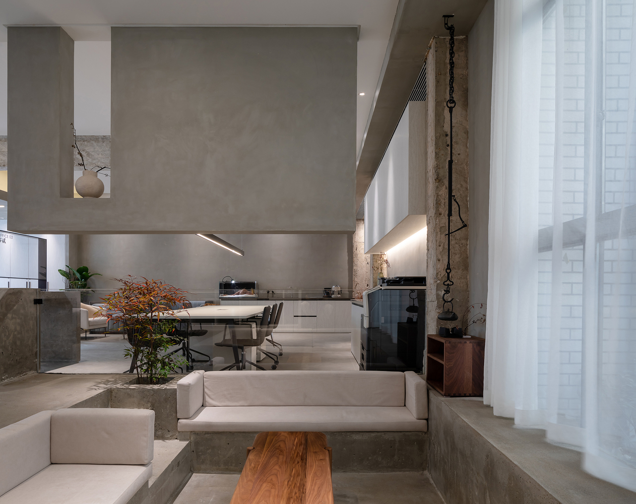 空間內部幾乎是完全開放的,融入建筑體塊結構。地面材質與立面一脈相承,高度平滑且統一。通過地面高度層階的控制,形成幾個不同的功能分區。窗邊局部下挖,與抬升區域并不刻意的結合,形成一個獨特的下沉社交空間。它打破了常規社交的高度和維度,手指所觸之處、身背所依之處、目光所及之處,皆是純粹卻充滿細節的建筑肌理。
