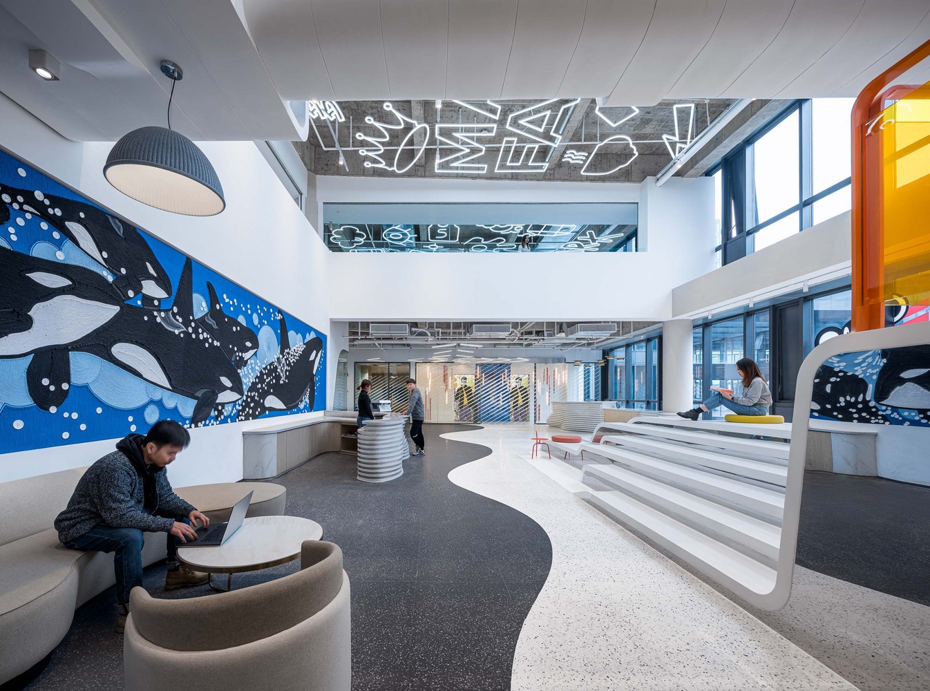 尖端時尚品牌馬克華菲(Mark Fairwhale)的總部位于上海。該項目基于品牌文化基因,主要運用了水與鯨魚的主題元素,并且創(chuàng)造出靈活而又敏捷的工作空間。同時借此呼應(yīng)其新鮮年輕的風(fēng)格定位。