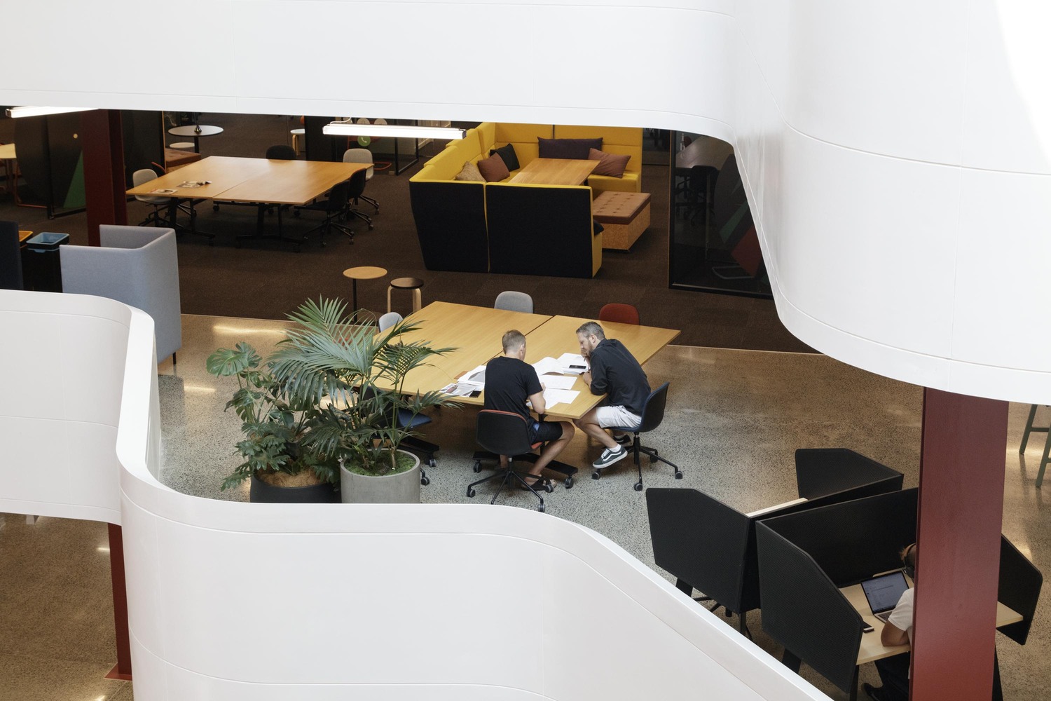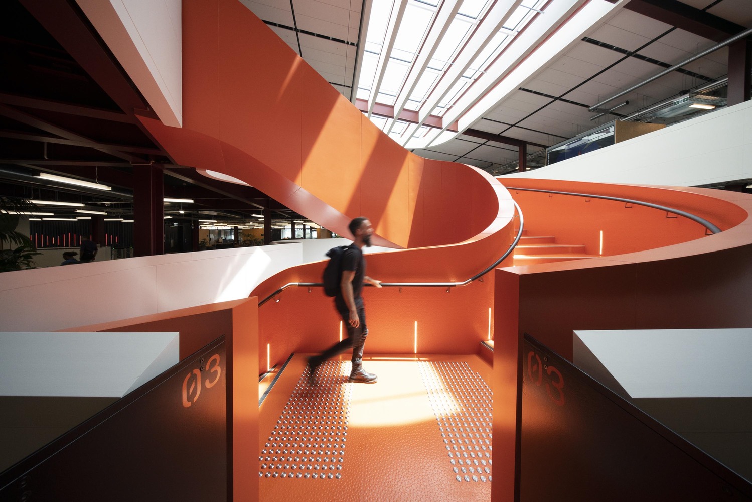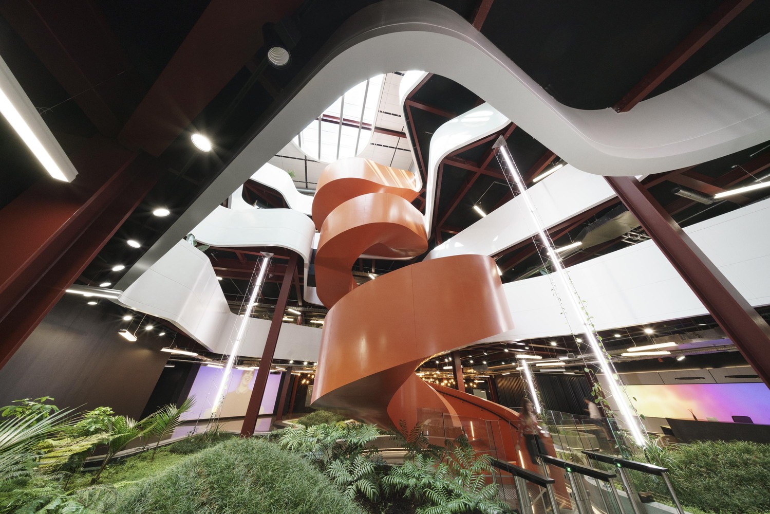 健康是新工作的主要考慮因素,而通過立面熱煙囪則可通過中庭吸入空氣來促進混合模式通風。中庭上方的大型透明天窗使陽光直射到建筑物的深處,而樓梯則整日為步行和提供能量。