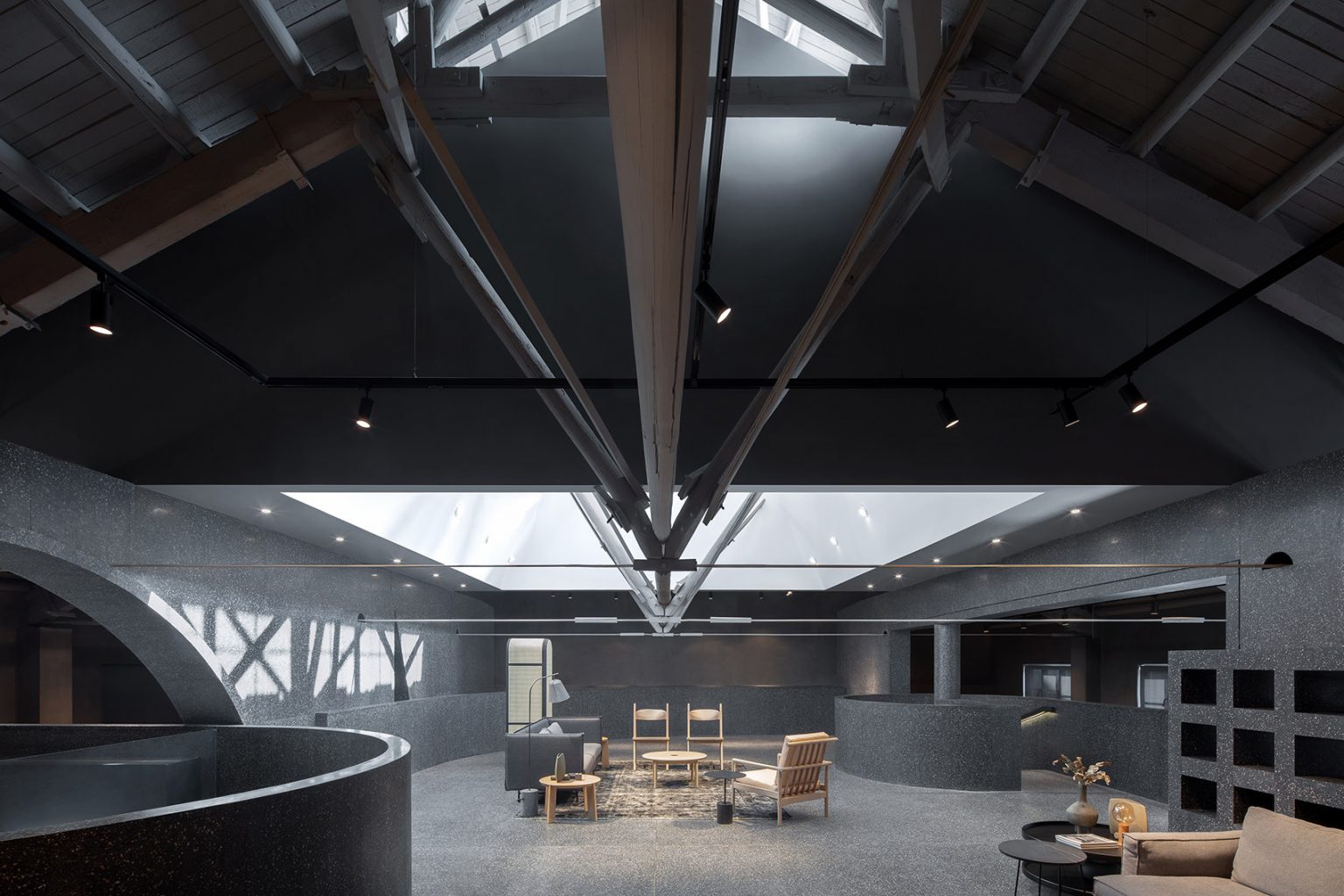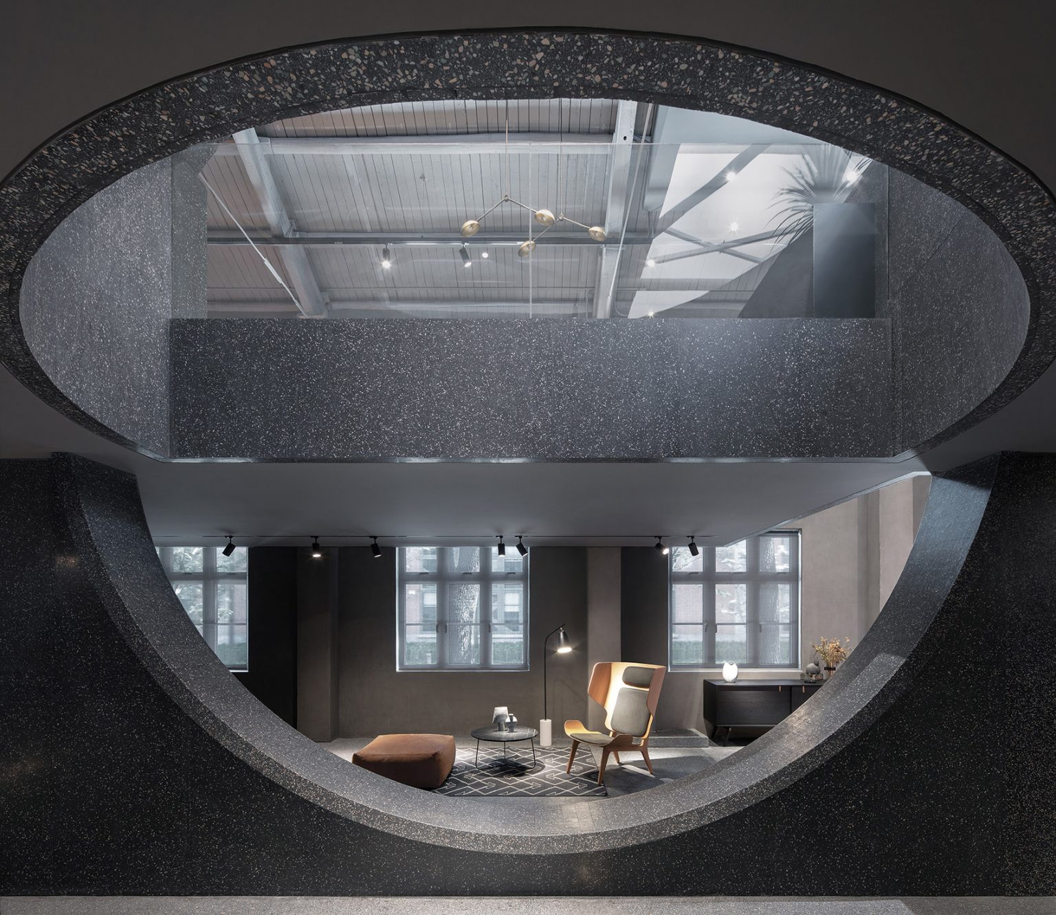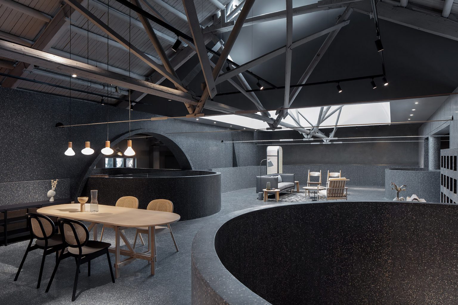 沿著樓頂上原有的一個狹小老虎窗,設計師用白色的錐體承接屋頂和引入光線,巧妙形成了天光采集放大裝置。陽光從老虎窗射在錐體內側的斜面上,被反射到空間內。不同的時間段,從圓形旋轉樓梯上樓,可以看到陽光被牽引入室內, 在黑色水磨石側墻上或在正下方的家具展品上投下光斑。暗色的背景里,光束傾灑于整個展陳空間內,精心分散布置的產品仿佛漂浮在深夜海面。以此達到產品被被空間更好的烘托浮現,吸引觀者的注意力,提供沉浸式的探店旅程體驗。