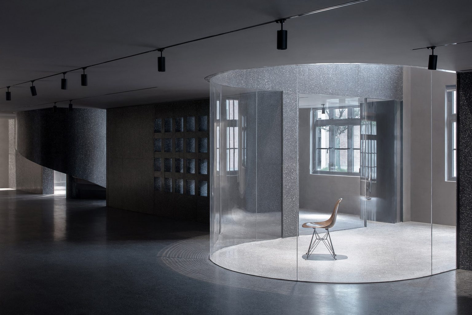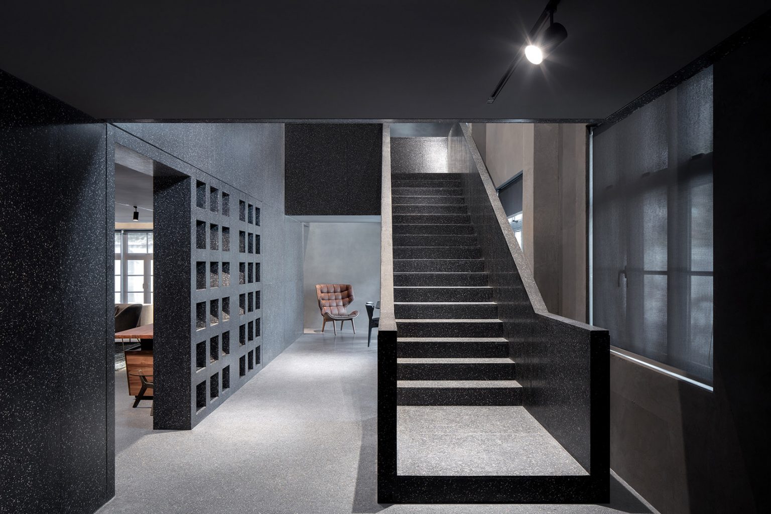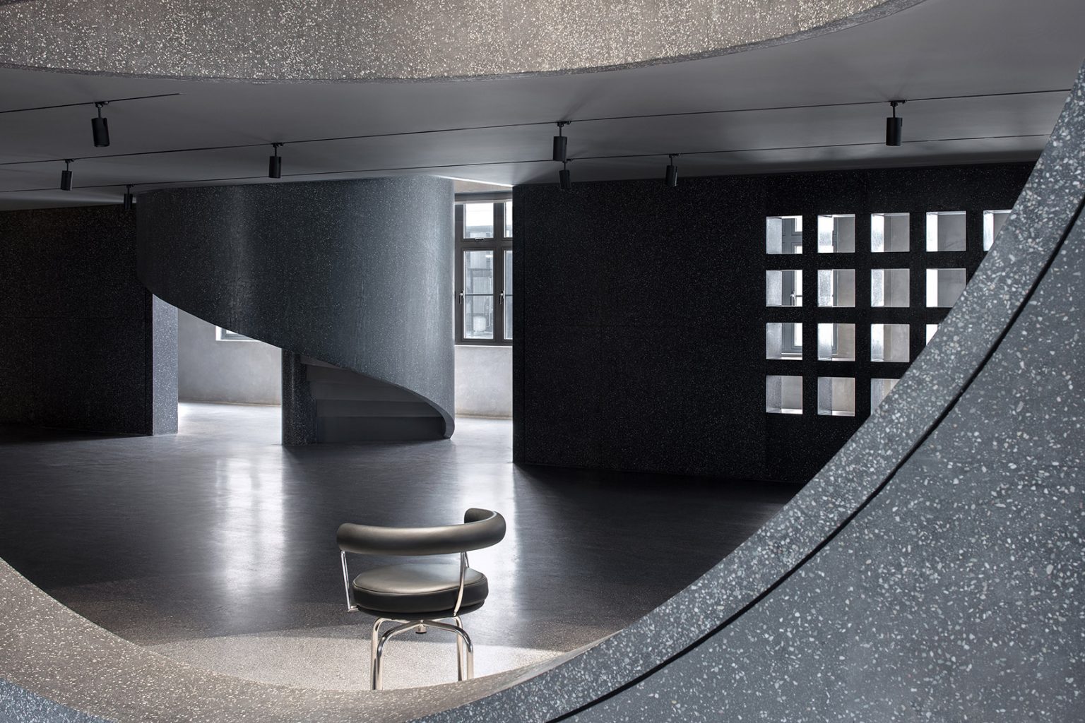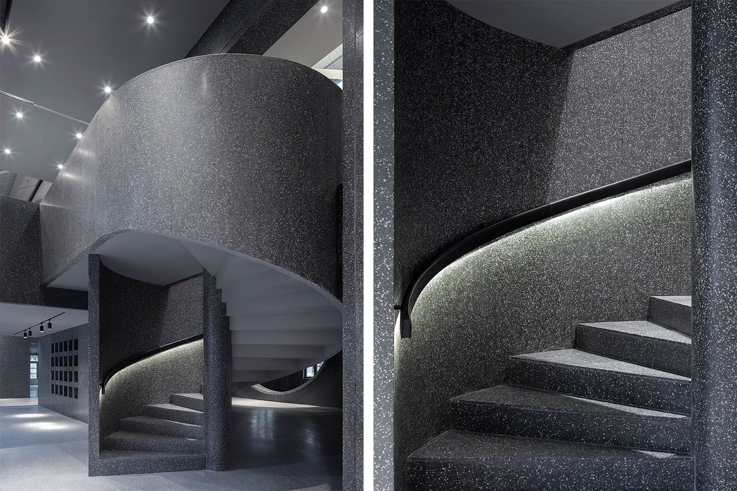 沿著樓頂上原有的一個狹小老虎窗,設計師用白色的錐體承接屋頂和引入光線,巧妙形成了天光采集放大裝置。陽光從老虎窗射在錐體內側的斜面上,被反射到空間內。不同的時間段,從圓形旋轉樓梯上樓,可以看到陽光被牽引入室內, 在黑色水磨石側墻上或在正下方的家具展品上投下光斑。暗色的背景里,光束傾灑于整個展陳空間內,精心分散布置的產品仿佛漂浮在深夜海面。以此達到產品被被空間更好的烘托浮現,吸引觀者的注意力,提供沉浸式的探店旅程體驗。