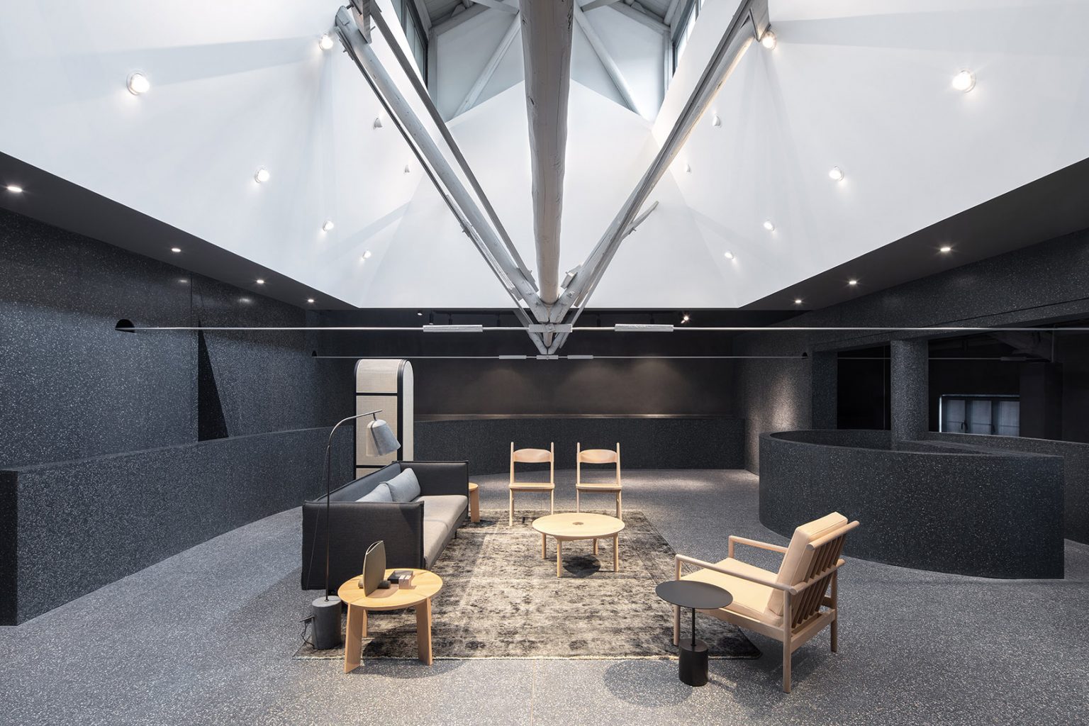設計師在單一的空間內部,構筑起兩片橫亙高聳的黑色墻體。將空間切成1:2:1的三進,形成中間展廳和兩邊側廊,分出主次區域和高度層次,以適應于不同大小體塊的家具陳設場景。兩組長達25米的連續墻面,也可以作為舉辦各種小型展覽及活動的背景。