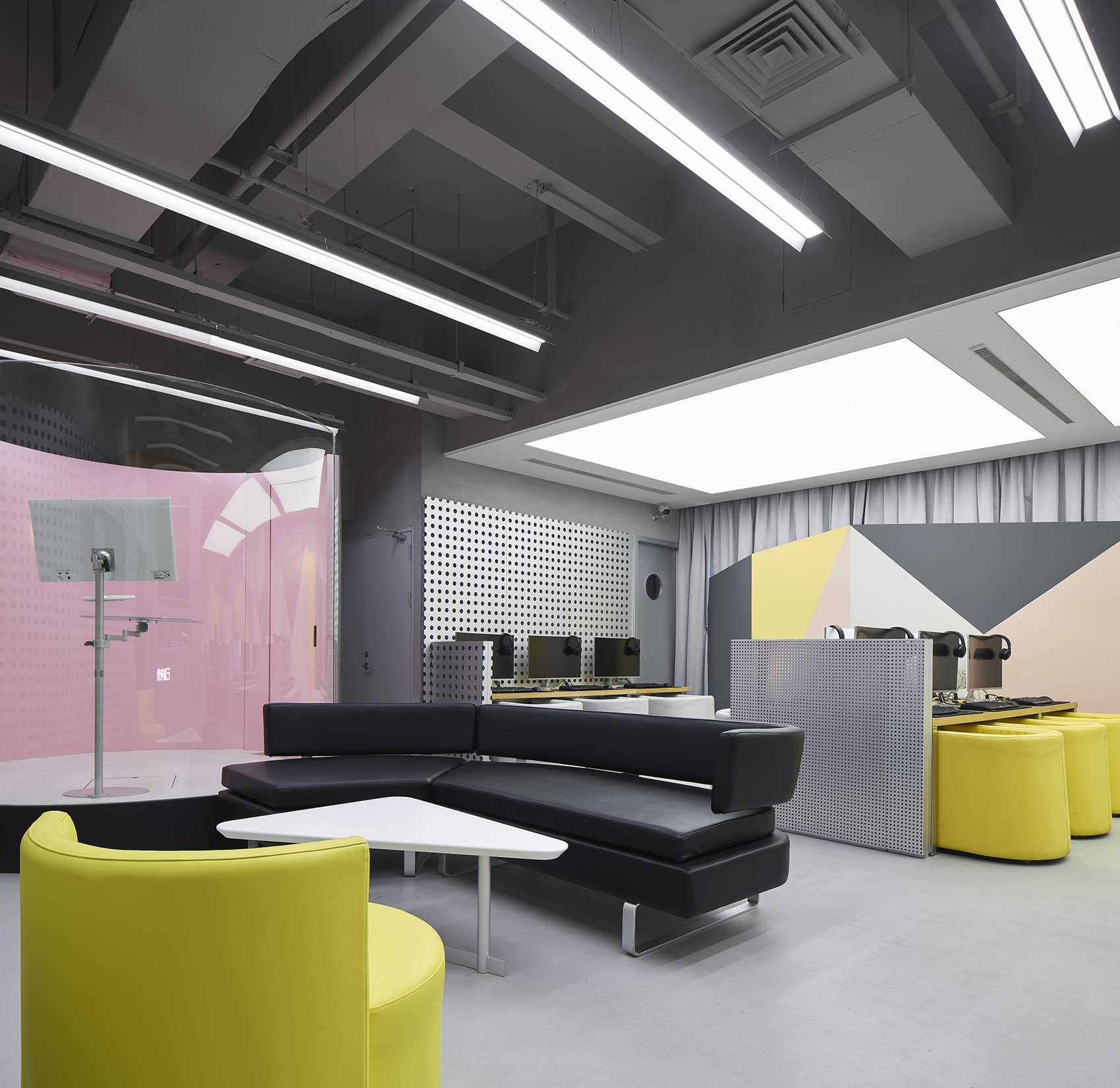 主播臺設(shè)立在入口處,配合冷靜的白色光源,是60年代科幻片的氛圍,那個年代,對于科技的理解是單純幾何的。使用不規(guī)則的三角色塊,在呆板里劃分出色彩感的外空間符號。