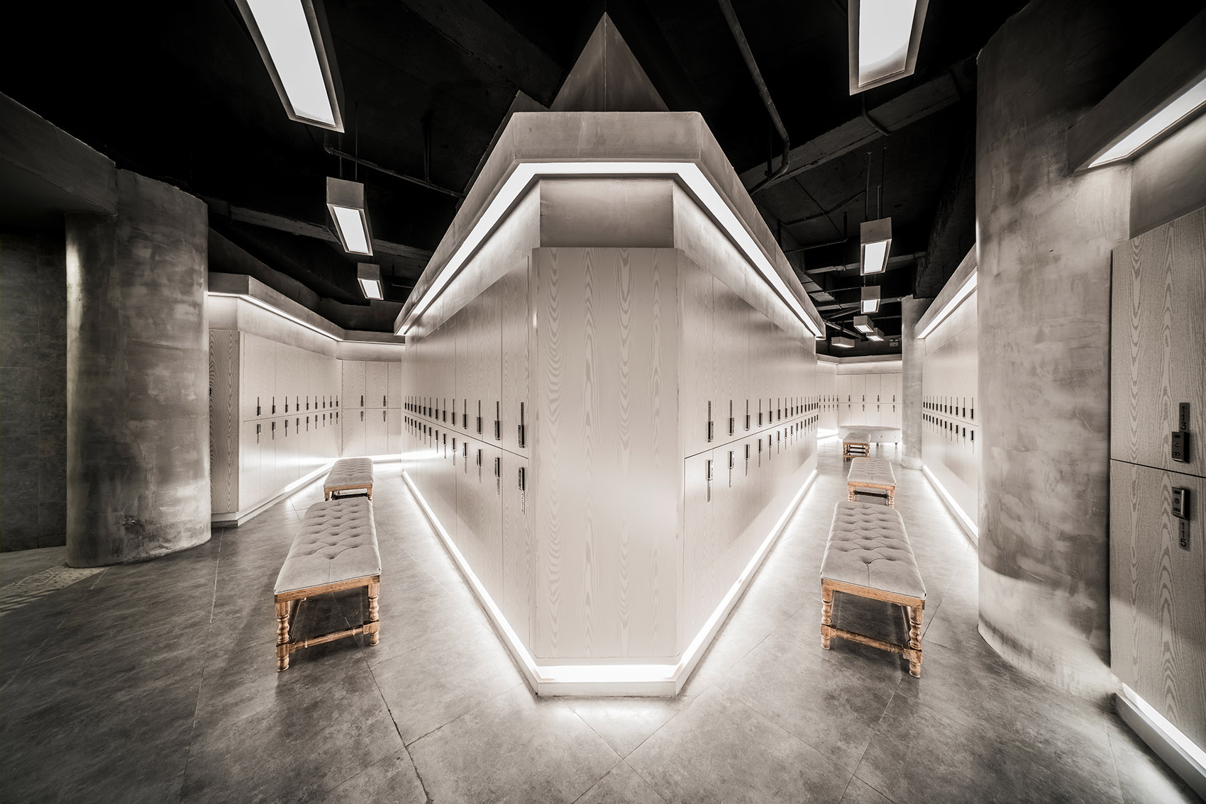 力量中的LOFT,只因?yàn)檫@里有高挑的空間,開敞的流動(dòng)性、穿透性,是其室內(nèi)空間所具備的氣質(zhì)與時(shí)尚,當(dāng)然這里還有意想不到的創(chuàng)意和空間改造。設(shè)計(jì)來源于橋梁的橋墩,橋墩架起擁堵城市中的環(huán)線,代表力量、堅(jiān)硬、純粹、樸實(shí),更多的時(shí)候強(qiáng)調(diào)城市中人們的生活壓力、枯燥,需要一種力量和方式來產(chǎn)生一種當(dāng)代人的一種生活方式,從而傳遞出“動(dòng)”“靜”的力量;在該項(xiàng)目中加入了許多堅(jiān)硬和挺拔的灰色,以周邊竹林相呼應(yīng),同時(shí)也能起到很好的景化作用,高級(jí)灰加鋼琴黑絕對(duì)有范,當(dāng)然還很酷,也結(jié)合了本案的名字。極致而富有力量的情懷,倡導(dǎo)炫酷、躁動(dòng)產(chǎn)生的平靜,摒棄喧鬧,回歸純粹健身房運(yùn)動(dòng)的追求。