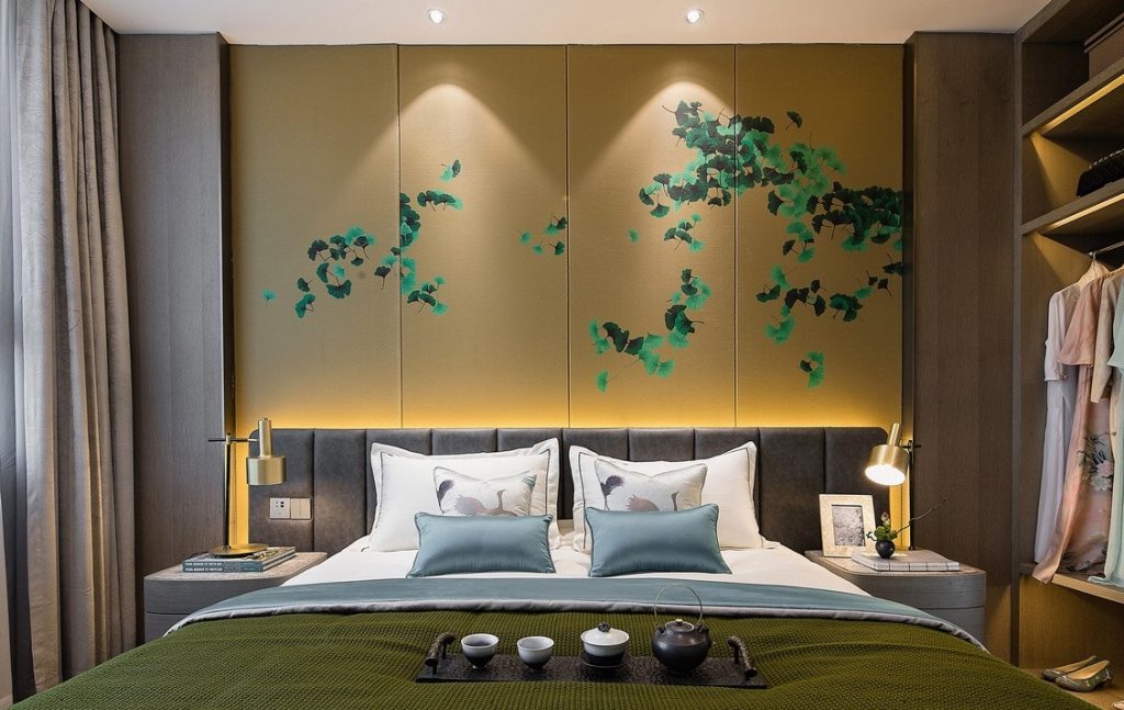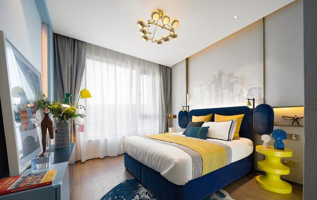 主人房延續了整個戶型優雅冷靜的調性,線條明快的家具搭配色澤柔和的木地板,落地窗外的自然風景成為了房間中最美的景致,同時營造出和諧舒適的感覺。