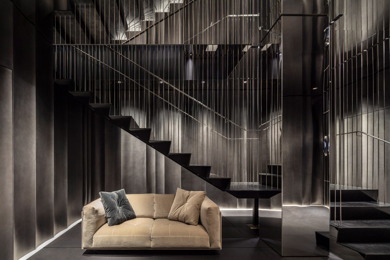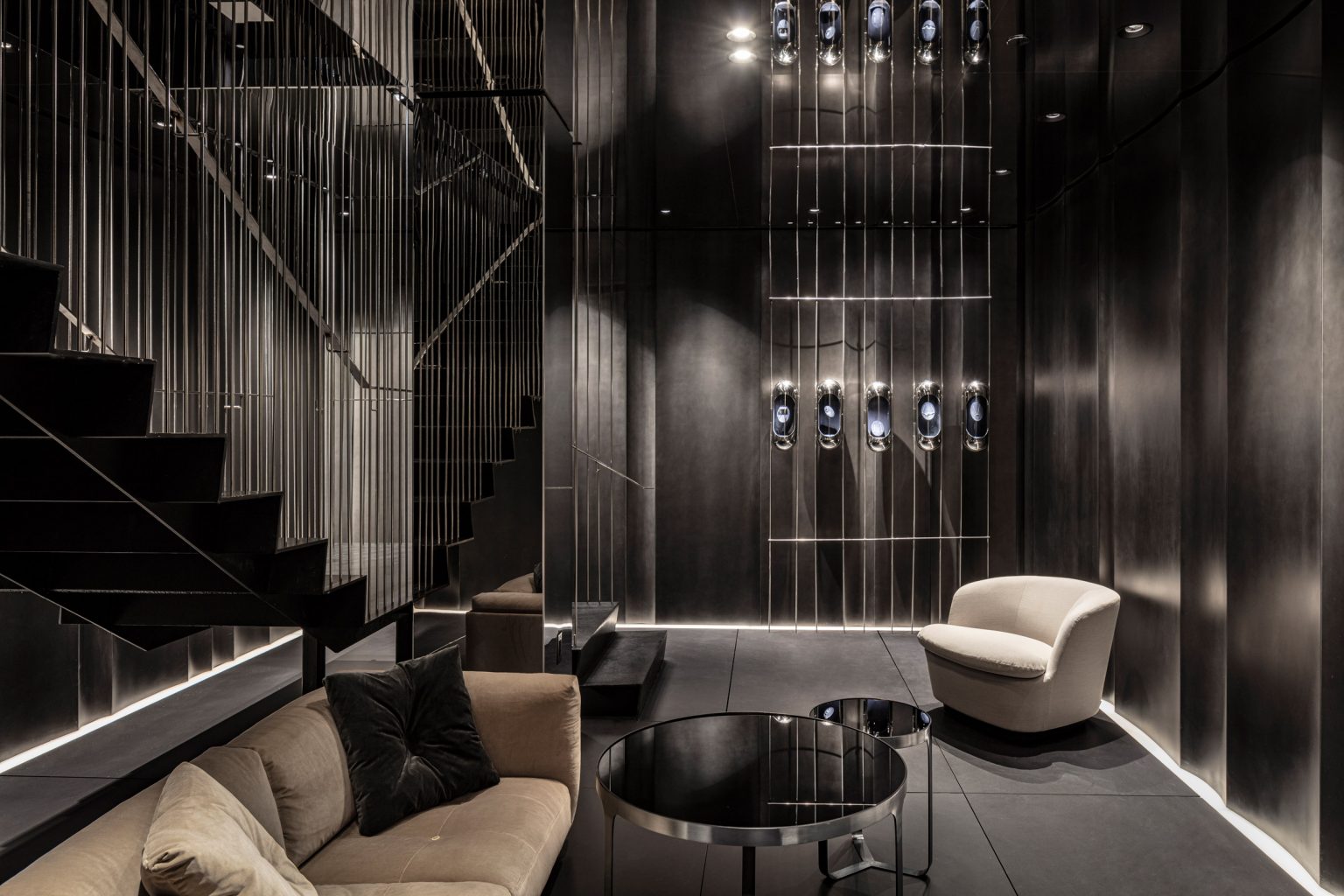 這是位于紐約SOHO區的珠寶品牌?me的零售商店,是由設計師設計的,具有黑暗,物質,氣味和聲音的“感官零售體驗”。設計師試圖將soho區建筑的裝飾性建筑風格與實驗室制造鉆石的技術過程進行對比。單色暗灰色倉庫的墻壁由碳鋼面板制成,為了營造出黑色的煙熏光澤,將面板用液體處理,然后上漆以停止化學反應,鋼制墻代表了曼哈頓下城附近起伏的鑄鐵立面所投射出的陰影。