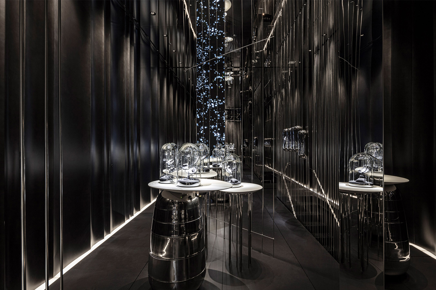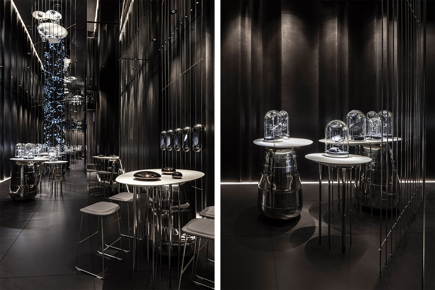 在商店內,從地板到天花板的一系列垂直桿用作分隔物,而所有包含合成鉆石的珠寶作品則在透明的玻璃容器(稱為鐘形)中展示。凝塊放在帶有白色臺面和銀色底座的桌子上。架子是金屬的,有不同的樣式,從體積大到帶有細長桿的架子。氣味還用于增強感官體驗,還為商店定制了帶有泥土,煙熏味的香水。