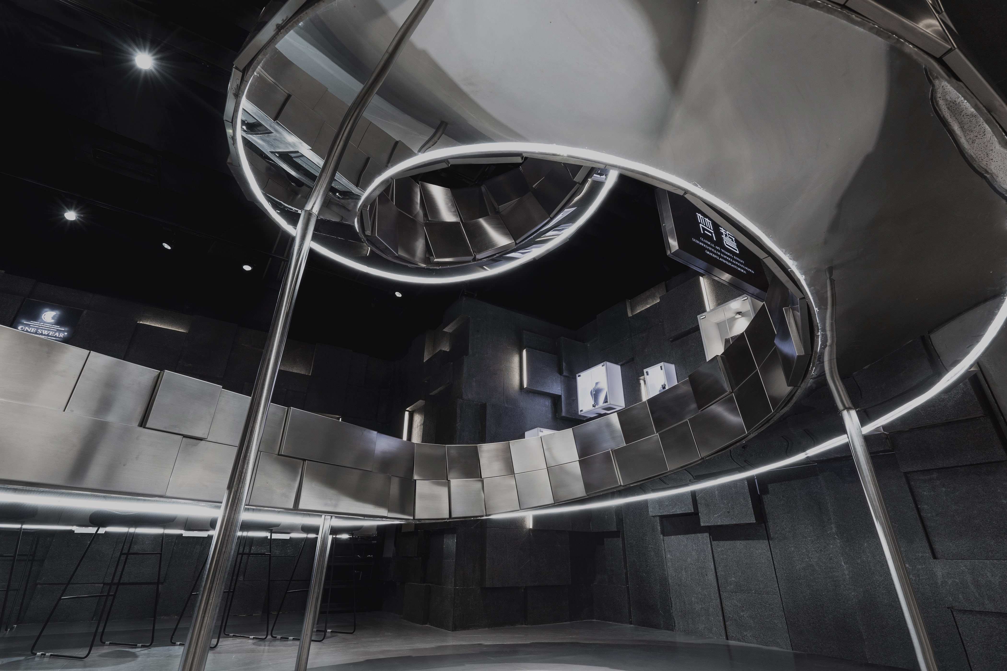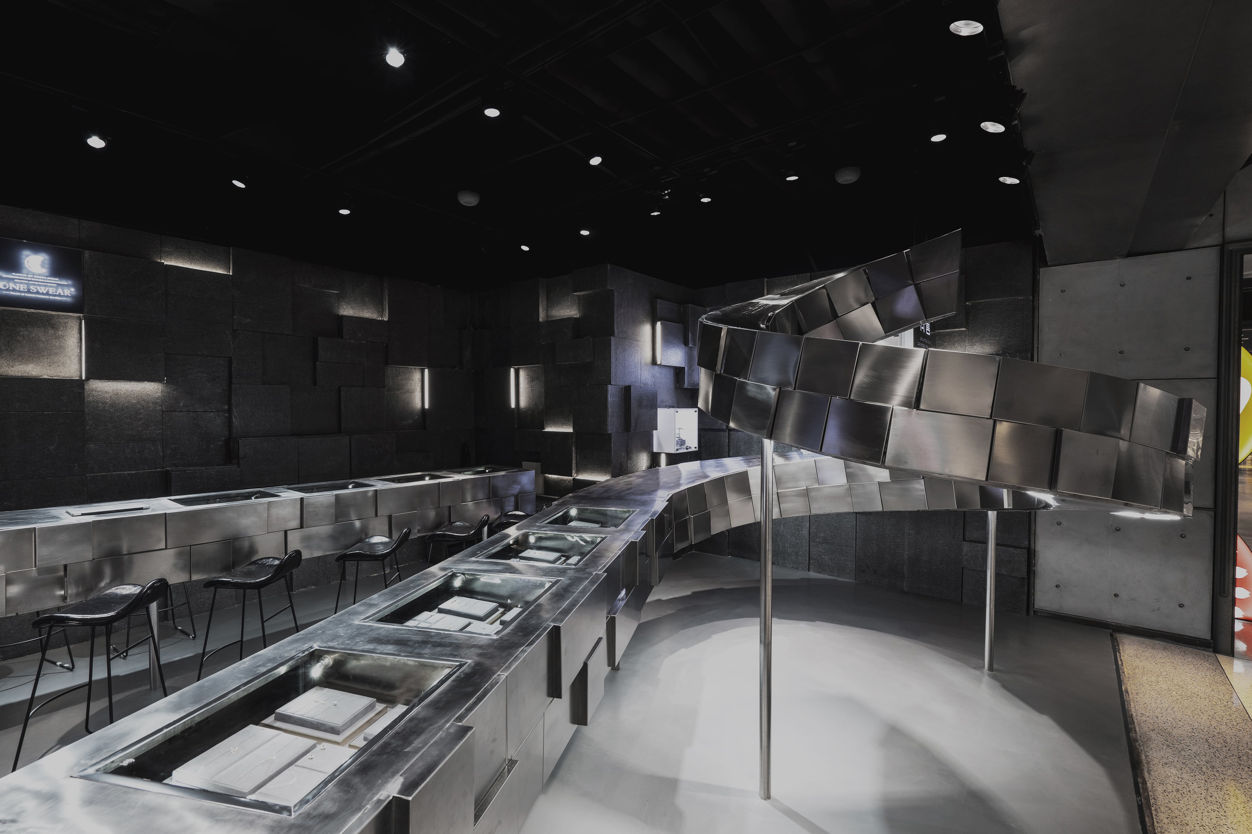 礦洞中的軌道流線是連接寶石與珠寶、財富與黑暗的紐帶,是空間中特殊的發生器。因此設計通過一條連續的紐帶串聯起整個空間的各種功能與邏輯:融合珠寶展陳,品牌展示,客戶洽談等多種功能。