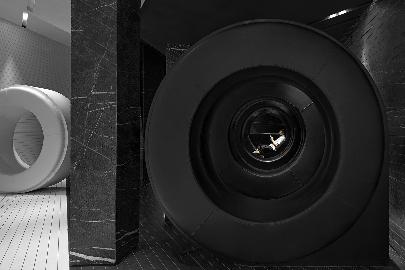 負(fù)片是經(jīng)過曝光和顯影加工后得到的影像,負(fù)片上的明暗關(guān)系與被攝物體正好相反。色彩與真實的顏色也是互補關(guān)系,實際紅色在負(fù)片上成青色。早前,照片的底片就是以負(fù)片的形式得以保存。大堂最震撼的視覺效果是紅、白分割的空間。空間中好像有一道看不見的光,將大堂分割成紅色和白色兩個空間,白色的石材從入口處向檢票口延伸開去,碰撞到紅色的石材之后,則整個空間瞬間變成奪目的紅色。