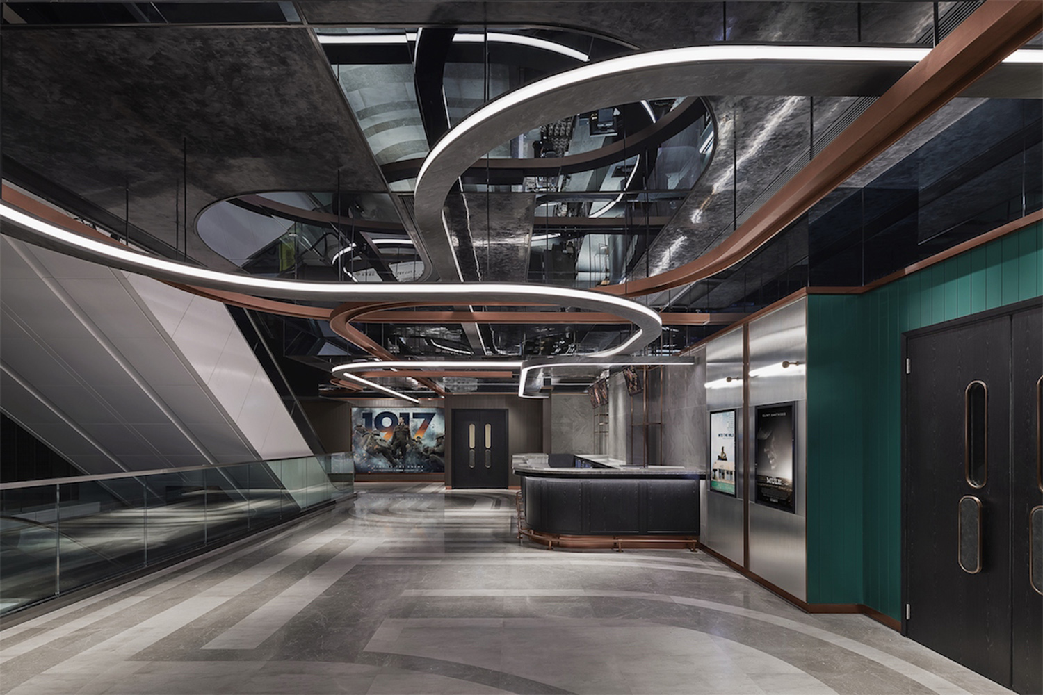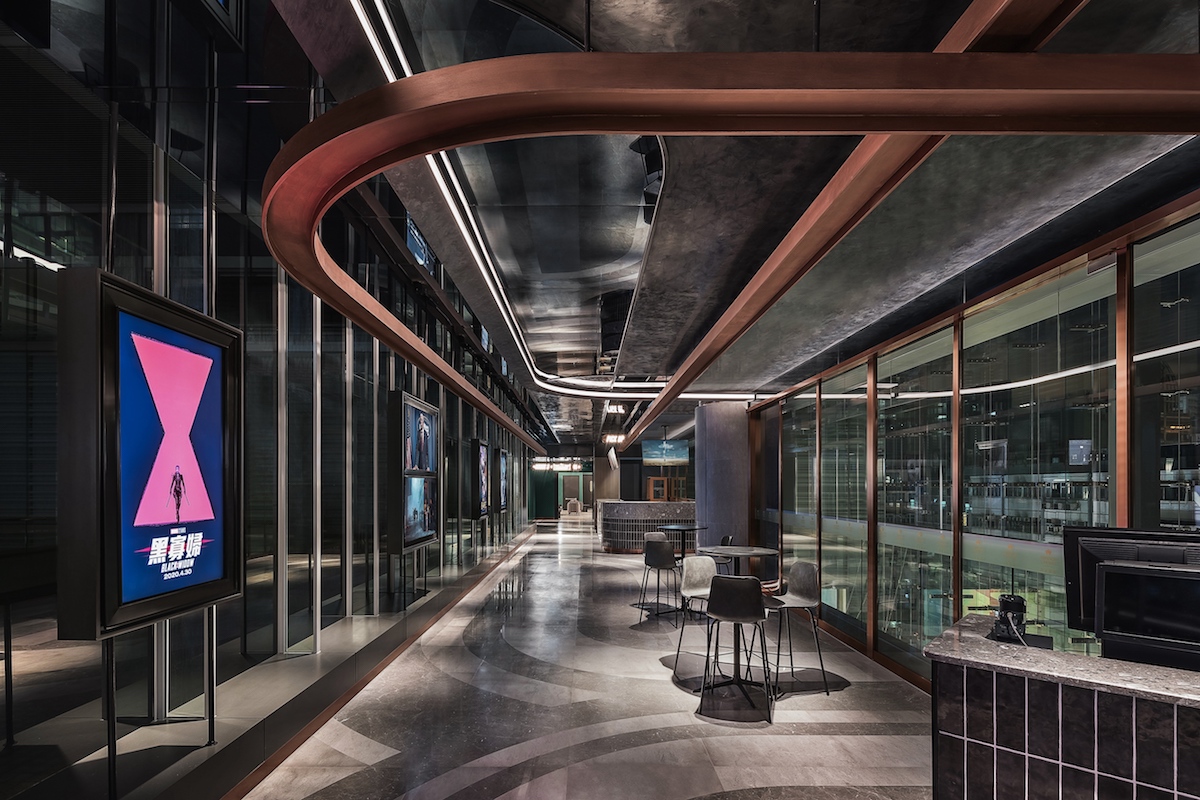 為確保空間的整體性與完整性,這條如立交橋一樣縱橫交錯、又充滿自身規律性的立體天花,在空中飛馳并貫穿著整個影院,把四個被縱向切割的空間連接起來。立體天花暗藏對電影的隱喻,展現了電影世界中人物、角色及故事主線并非孤立存在,也正是這樣晦暗不明的線條與光影交錯,才構成了電影人物豐富的層次與故事情節的錯綜復雜。