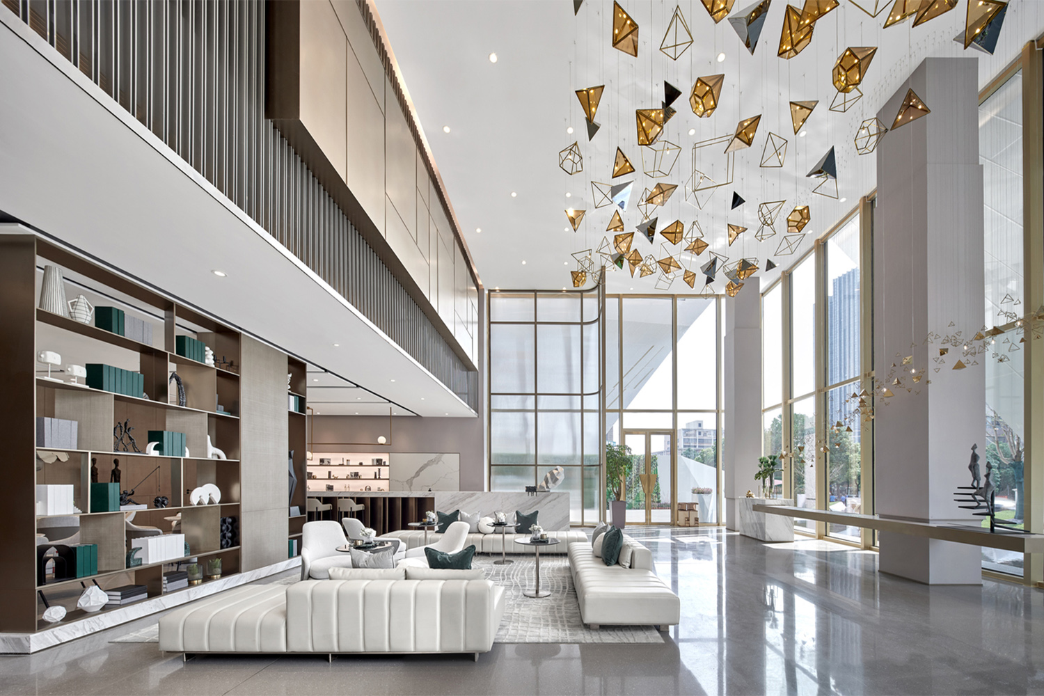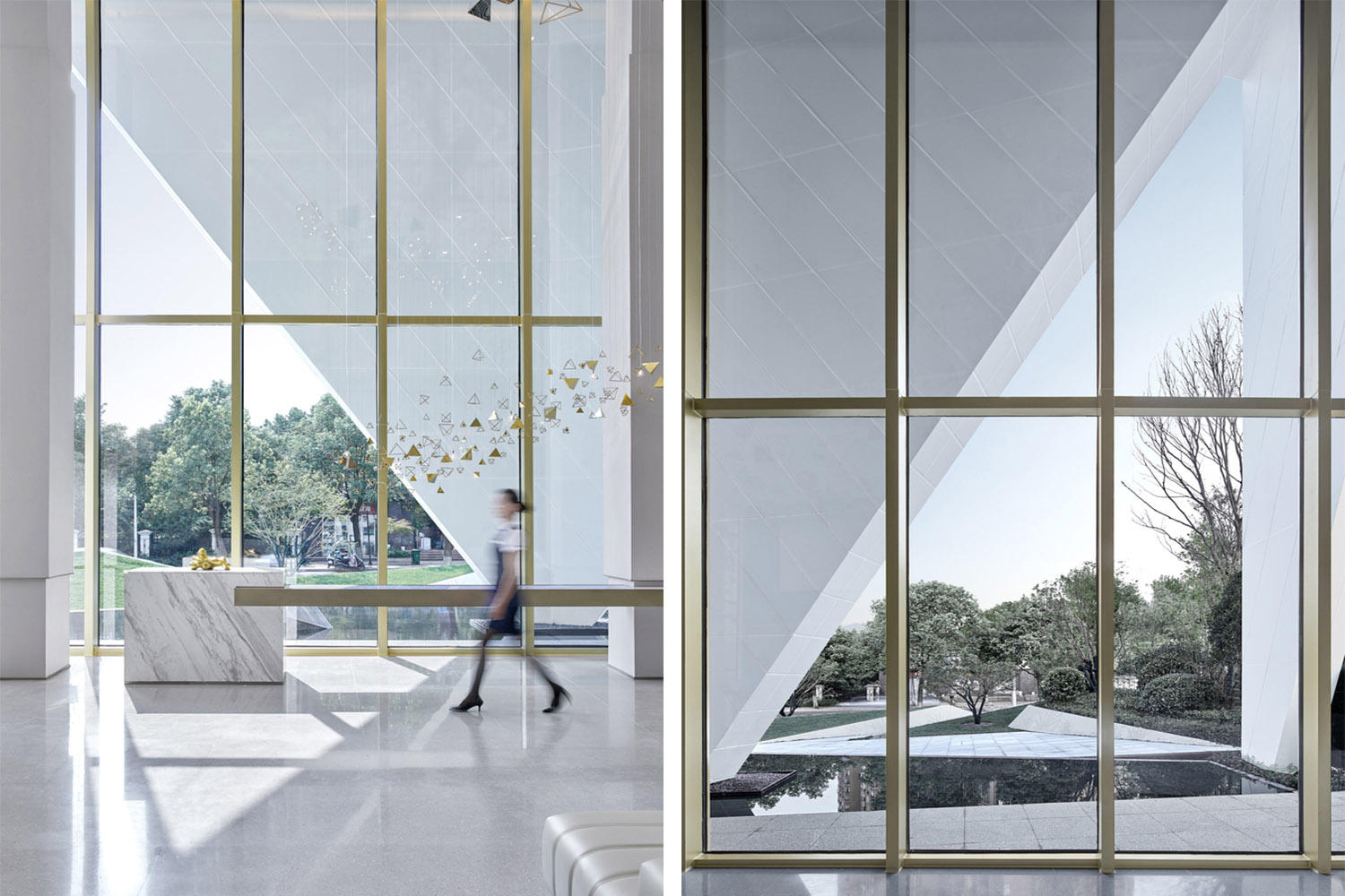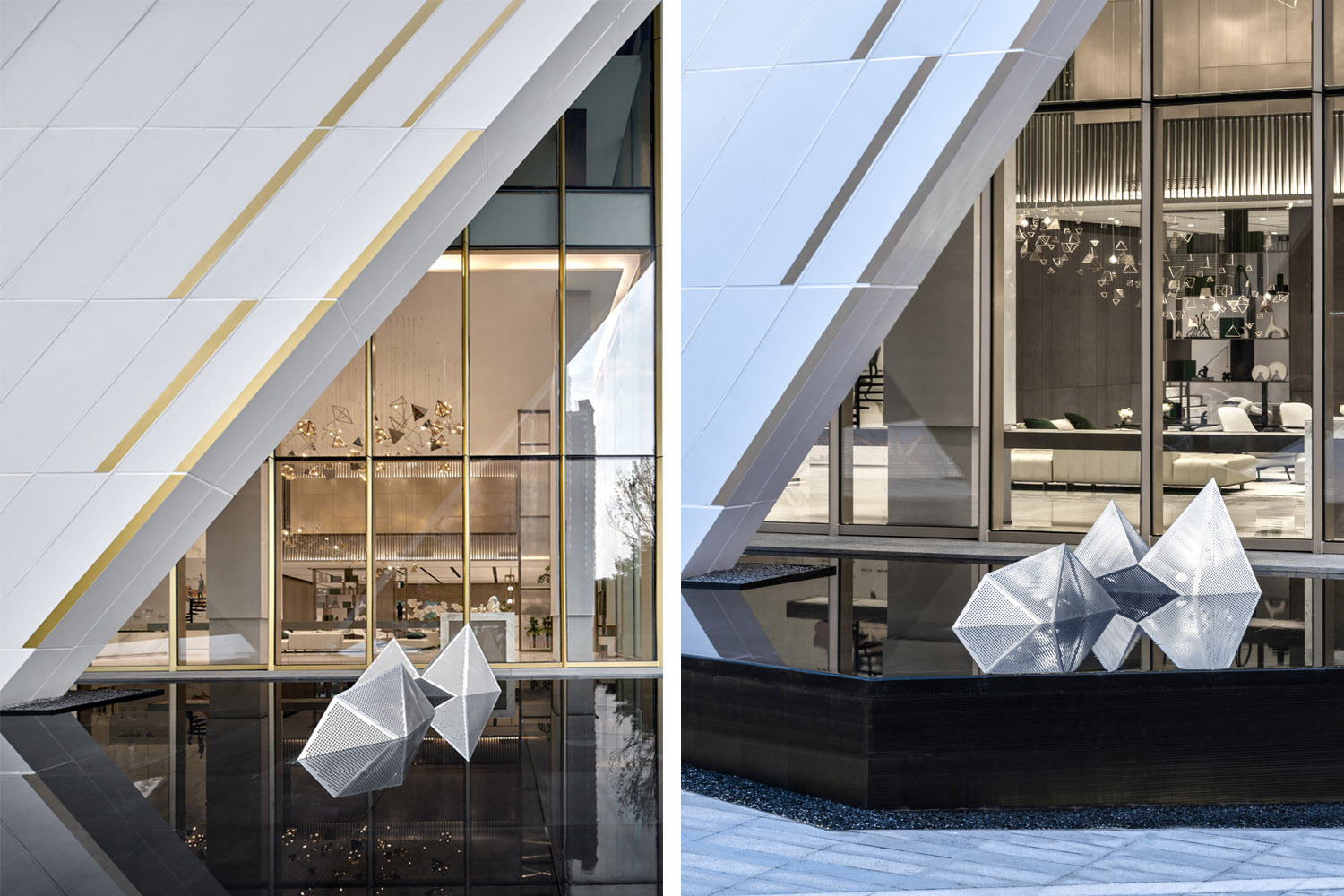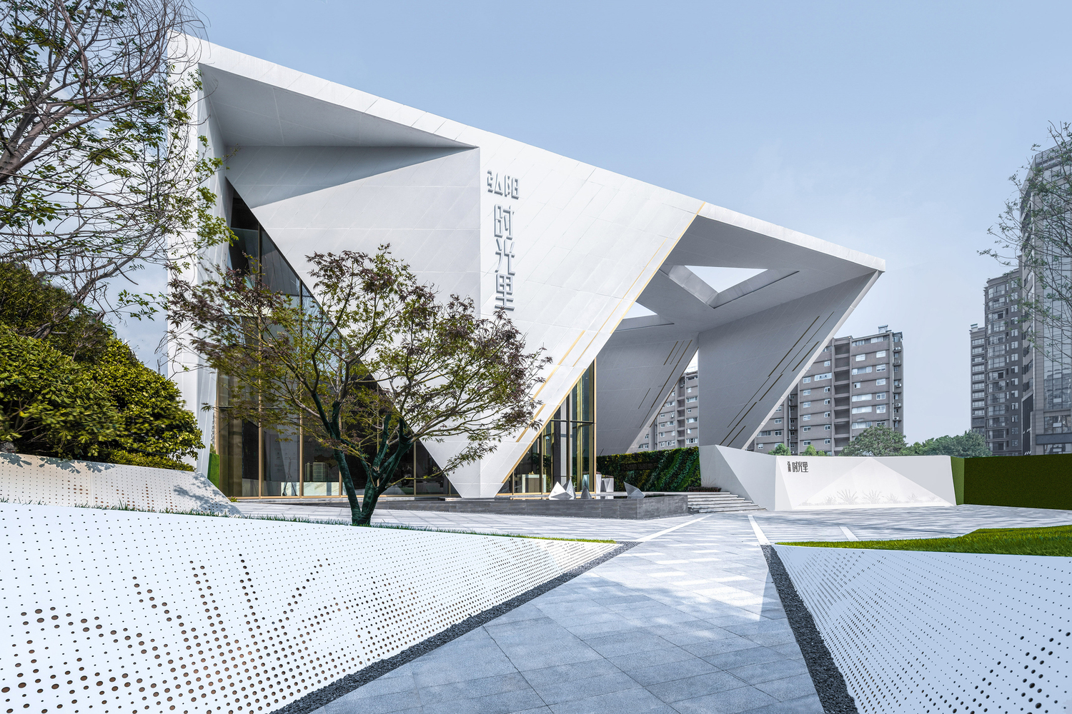 建筑設計:一系列折疊板象征著“跳舞的起重機”的輪廓,將住宅和地下室的入口以及拱廊相互結合,使展示面沿街道的長度加倍,并增強了城市的能見度接口。我們不想使用太多的材料來破壞純設計,因此主要材料被控制在以下三種中:沖孔鋁面板,超白鋼化玻璃和仿銅不銹鋼(幕墻垂直面板)。另一方面,鋁板的搭接采用平鎖方法,不僅保證了接縫的清潔整齊,而且避免了由接縫法引起的膠色差。