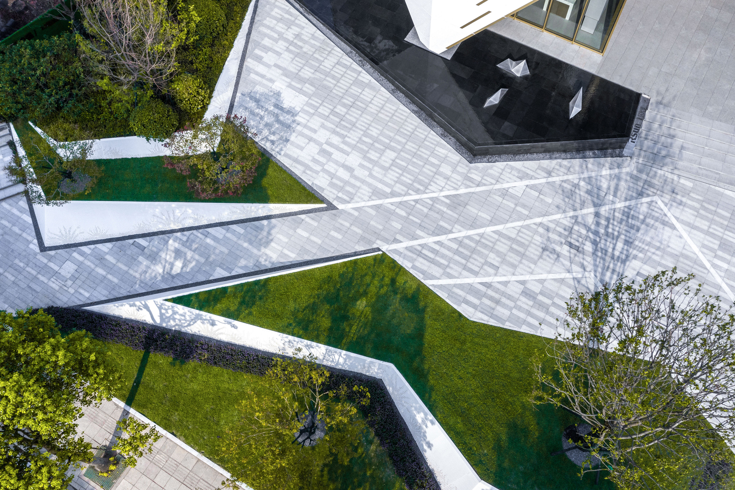 土地使用面積有限,高度差復雜,寬度窄,體積小:該建筑距離城市道路僅23米,因此很難形成儀式空間序列。此外,周圍環境與站點本身之間的高度差接近3米,我們需要一個明智的策略來解決一系列問題:站點與城市道路之間的高度差,未來商店的可達性,坡度要求消防通道和救援地點,避免使用地下車庫入口。此外,面向城市道路西側的主立面寬度僅為16米,僅占沿線項目總寬度的12%街。更糟糕的是,北部和南部的兩側都有大型高層建筑。銷售辦公室的整體規模太小,難以引起注意,很難獲得良好的宣傳。