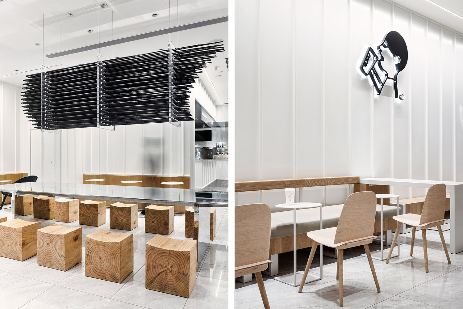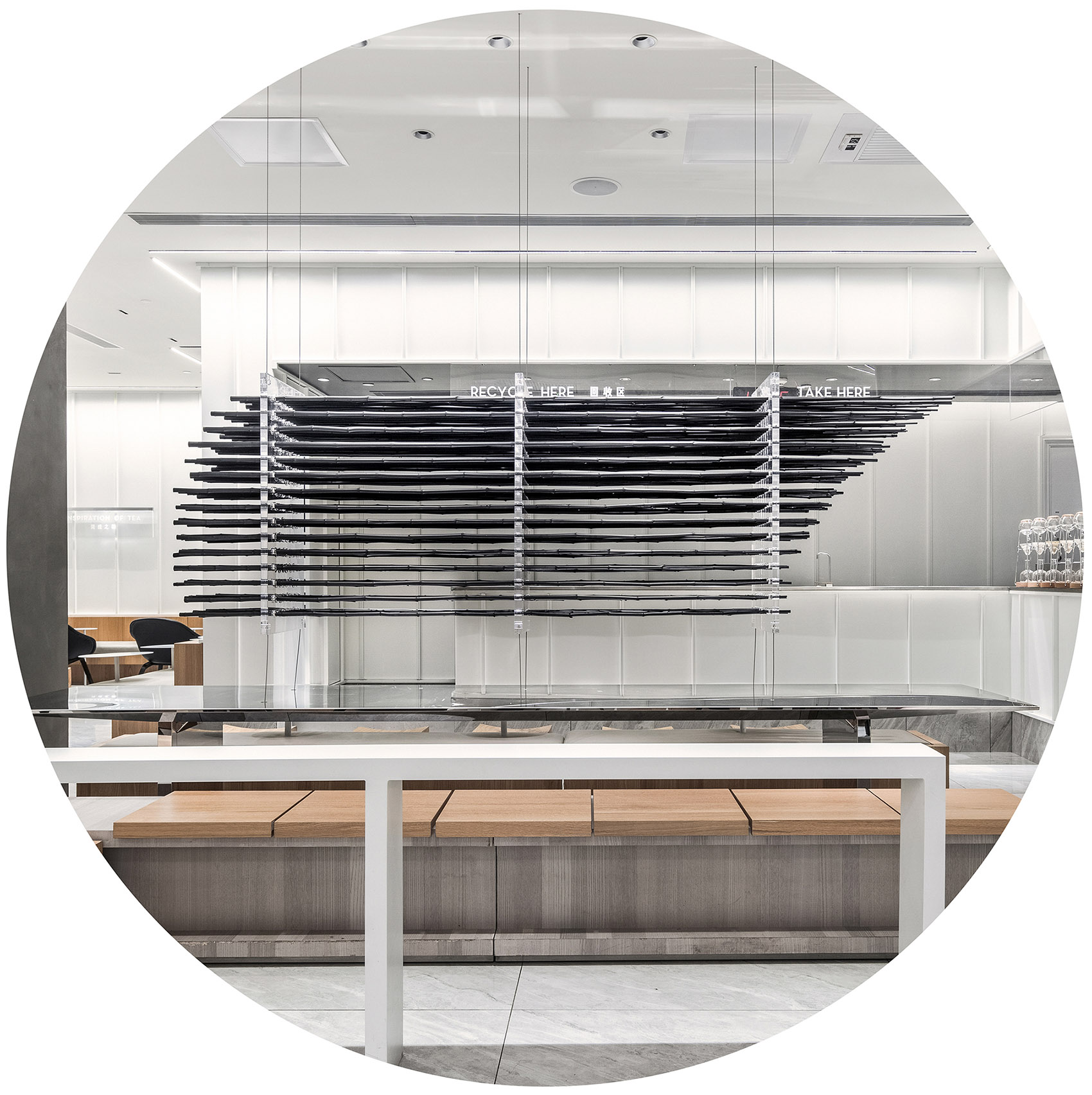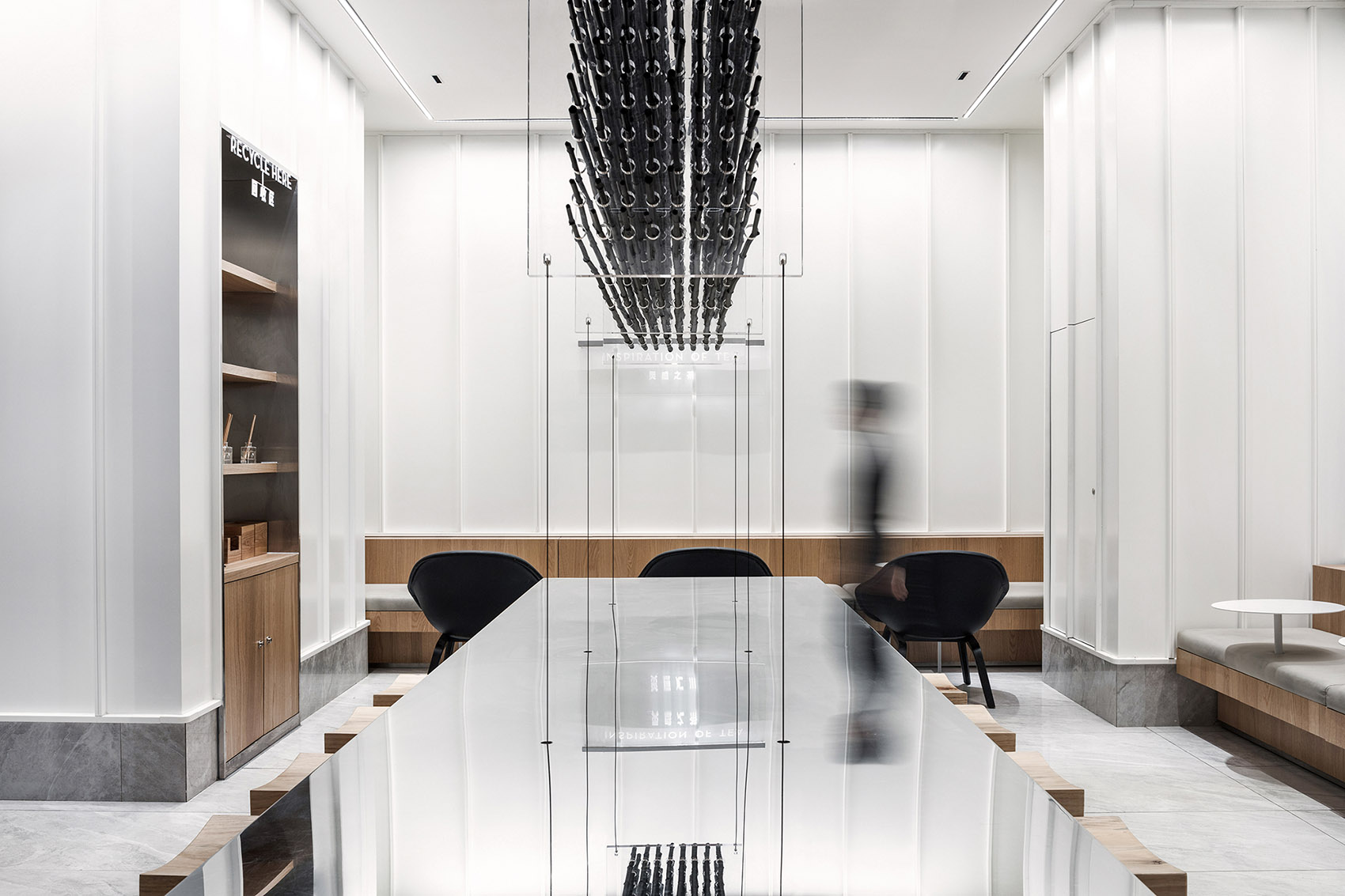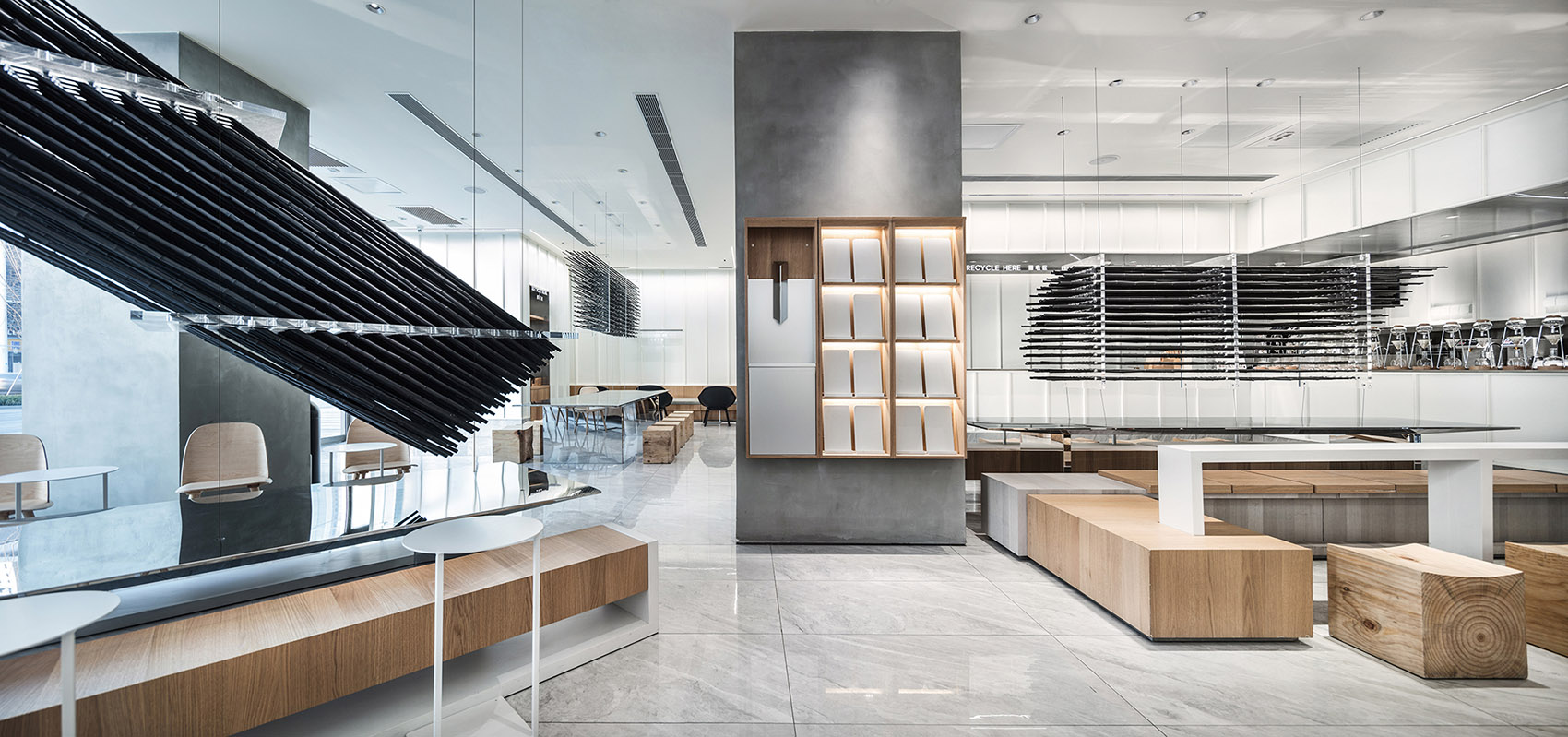 空間主材:白色鋁單板、黑色竹子、亞克力、鏡面不銹鋼、瓷磚、混凝土涂料、木材、玻璃