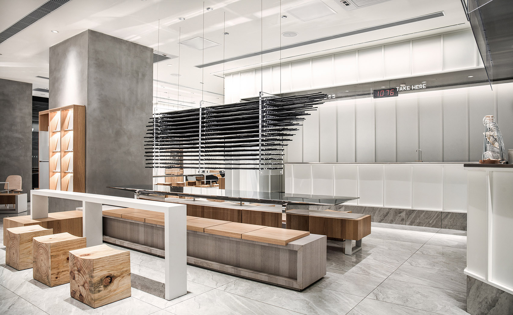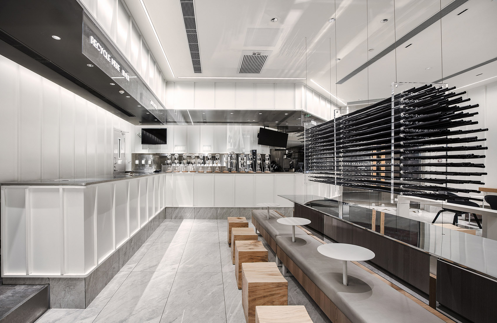 在這個茶飲空間中,設(shè)計師通過將中國傳統(tǒng)書法藝術(shù)用年輕人更關(guān)注的現(xiàn)代手段重構(gòu),探索傳統(tǒng)書法藝術(shù)在新時代語境下的可能性,從而達成空間設(shè)計與喜茶在品牌精神的高度契合。