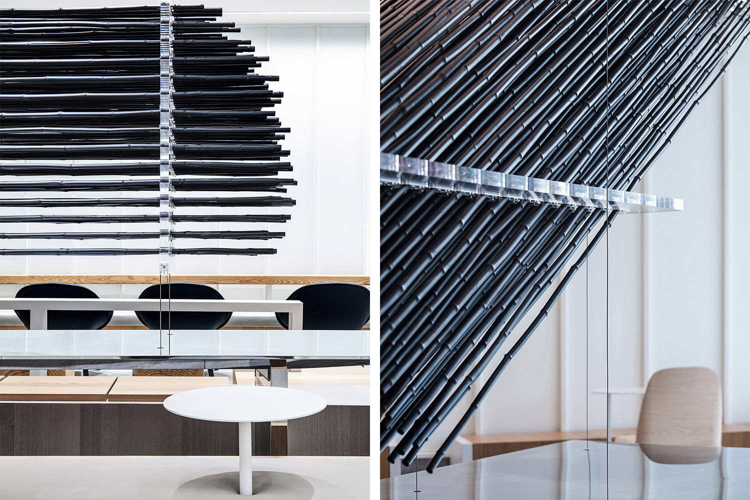 設(shè)計師將書法藝術(shù)中水墨筆觸的印象,以藝術(shù)裝置的形式在空間中立體化呈現(xiàn)。白色的空間為紙,懸浮于空間中的黑色竹子構(gòu)成的藝術(shù)裝置,如同在三維空間中落筆揮毫。