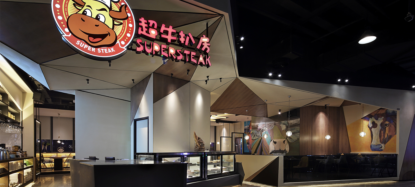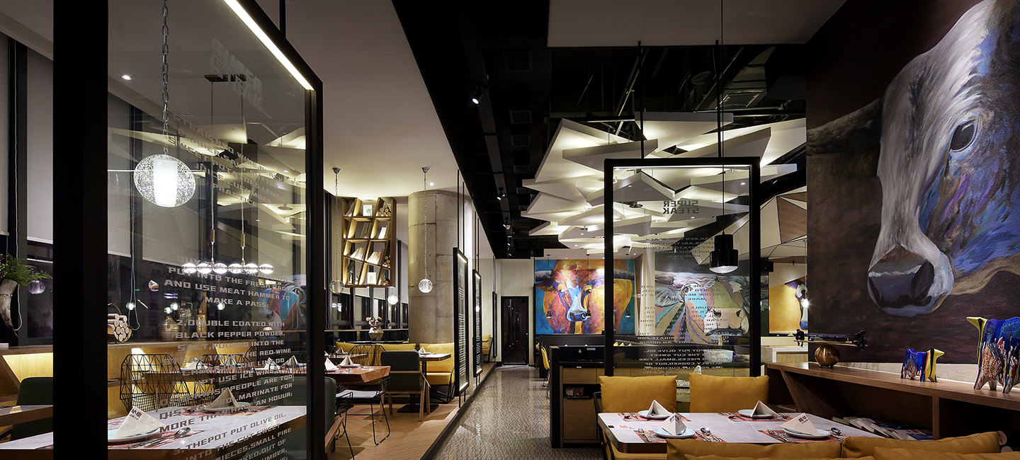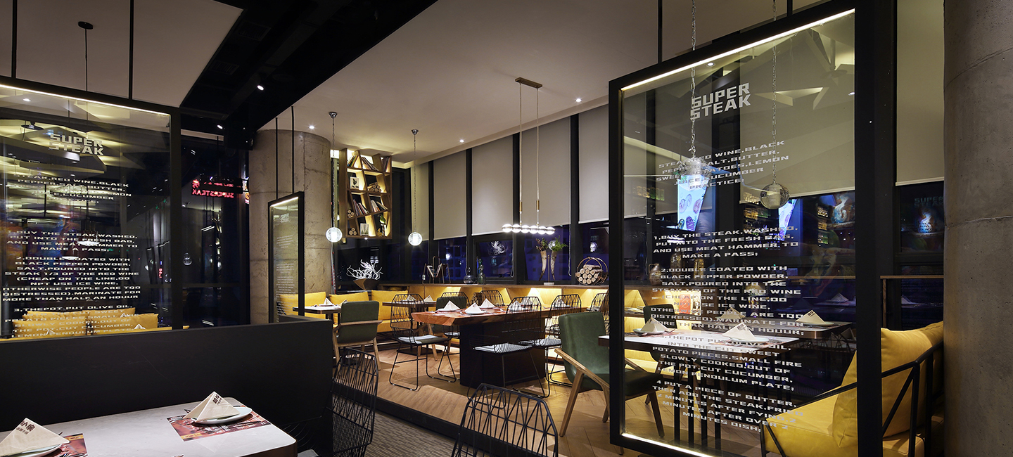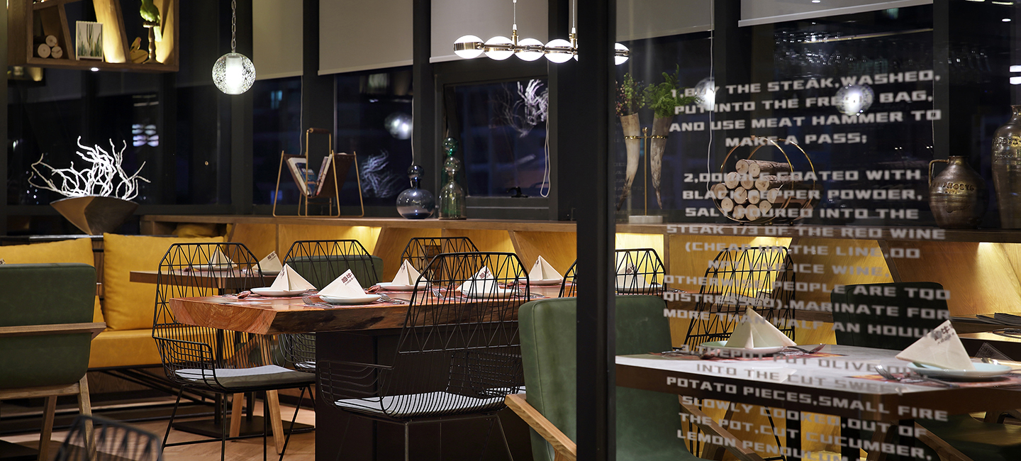 位于餐廳內部的兩根大型承重柱,作為這次西餐館設計的另一個空間缺陷存在,為了讓其化缺陷為亮點,設計師在保留原有造型的基礎上,柱子加入保護漆,保留水泥柱原有的紋理,水泥柱與精致的幾何切割面形成呼應,為整個空間注入一股粗狂的氣息。餐廳內的玻璃隔斷,采用熱軋板噴漆做邊框,在滿足功能分區的同時讓空間通透且富有視覺流動性,同時玻璃隔斷上為食客們展示了果木牛排的制作方法。